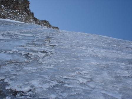 Eis und Finwand mit bis zu 55°, bei starker ausaperung können auch leichte Kletterstellen vorhanden sein.