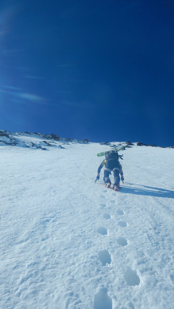 Die Wand hat zwei Teilstücke, ein kurzer Steilaufschwung wird durch eine flachere Passage unterbrochen die dann in die Gipfelwand mündet.