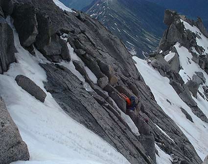 Wer aber schon mal auf der Berlinerhütte ist, kann die 150 m hohe Firnwand ruhig mitnehmen, denn die Rinne führt fast direkt zum Gipfel. Im Hoch-/Spätsommer hat man im oberen Teil sehr viel Felskontakt, weshalb die Westrinne nur im Frühsommer ideale Bedingungen aufweist.
