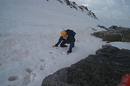 Firn bzw. Eis bis 45° - 50°, Abstieg Firn und Fels bis M3