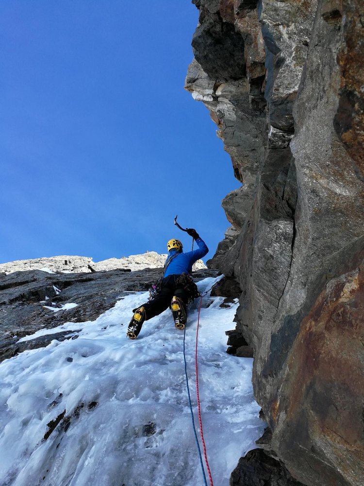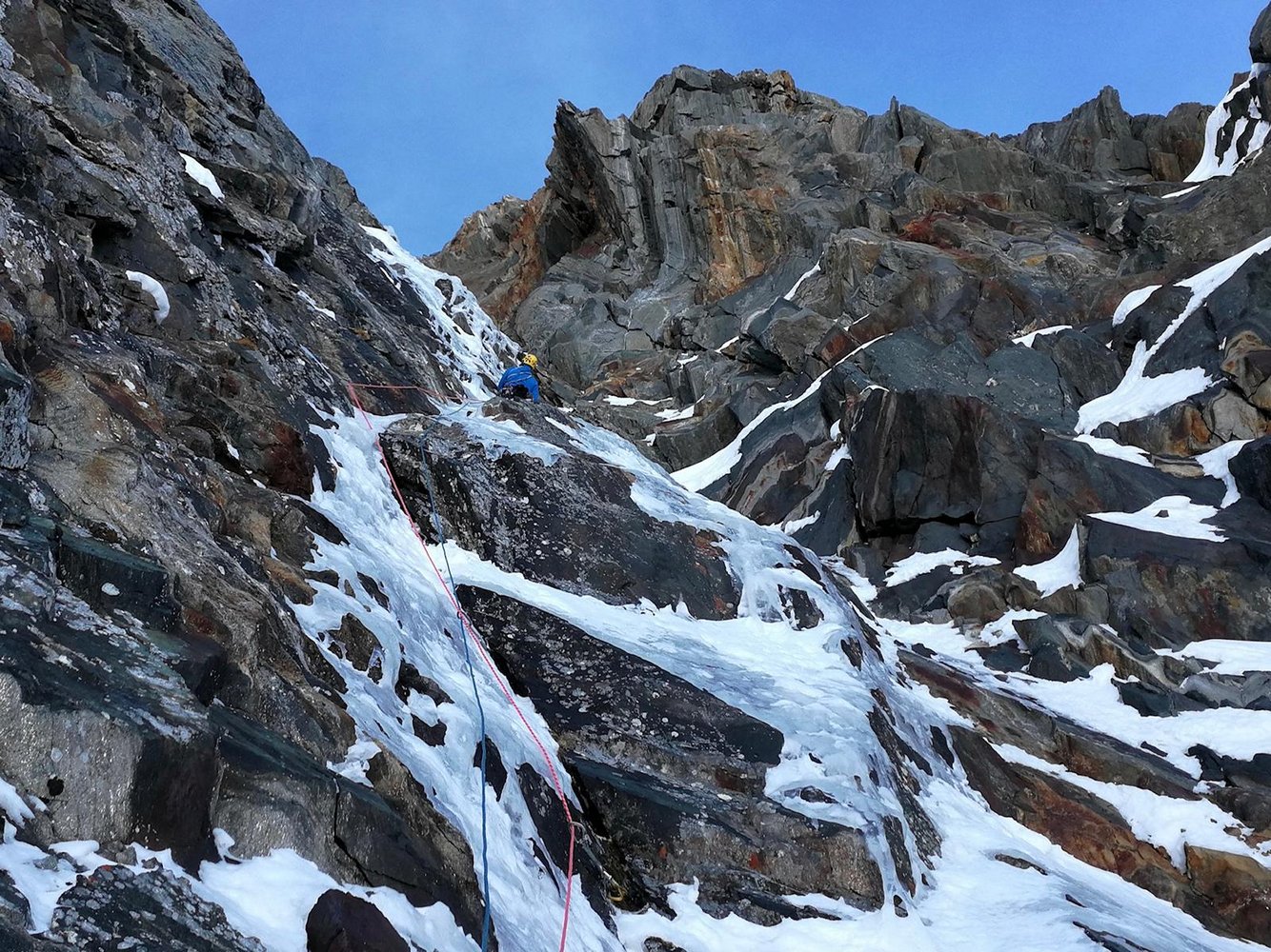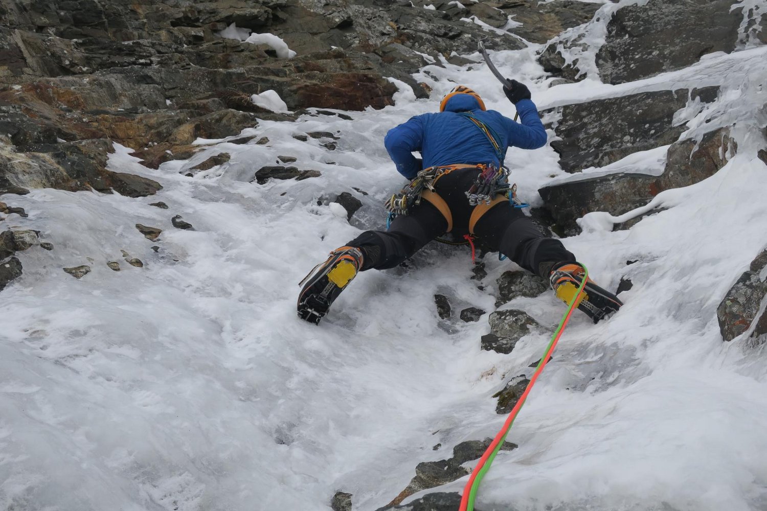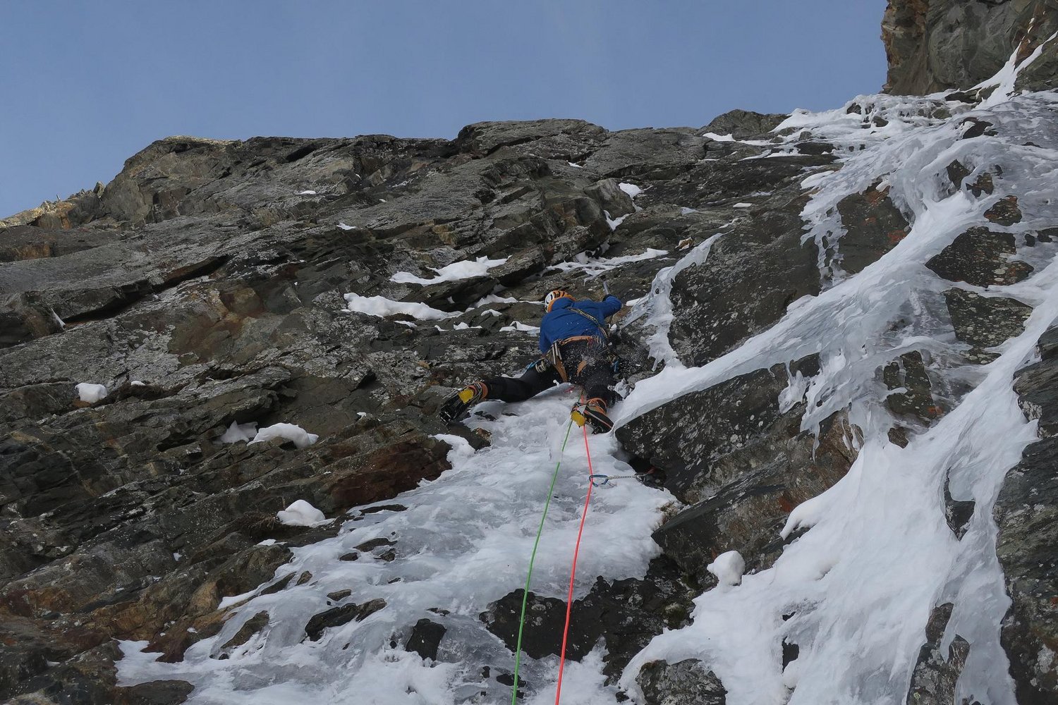 M6/WI5/R anspruchsvolle alpine Route zum selber Absichern. Die Angegebenen Schwierigkeiten beziehen sich auf den aktuellen Zustand der Route und können sich je nach Ausformung des Eises ändern.