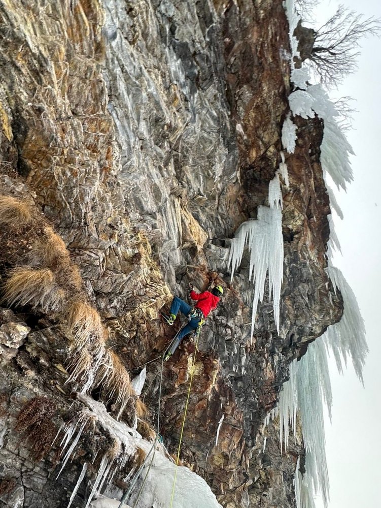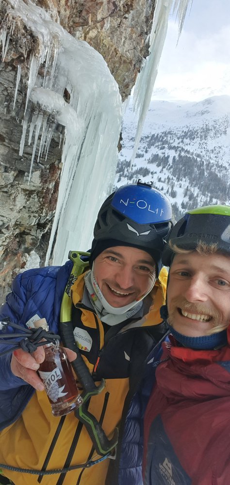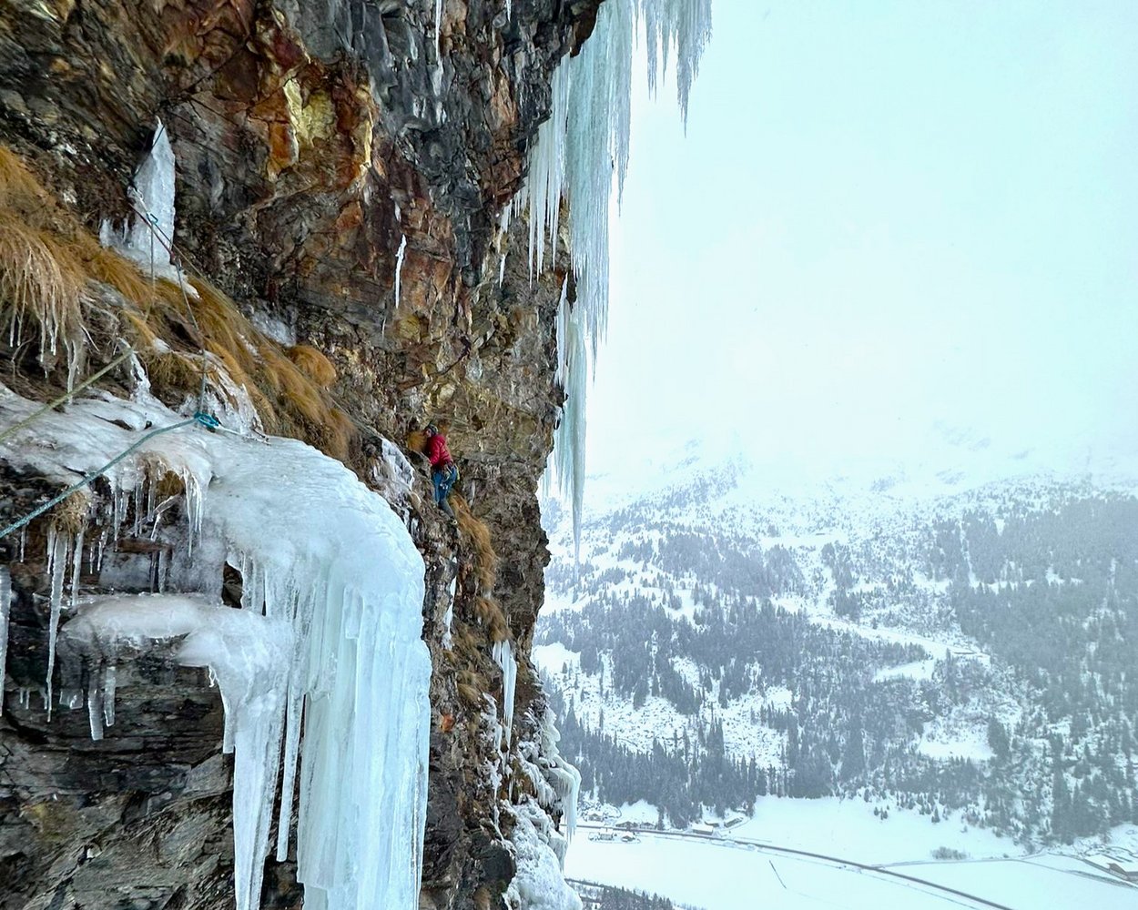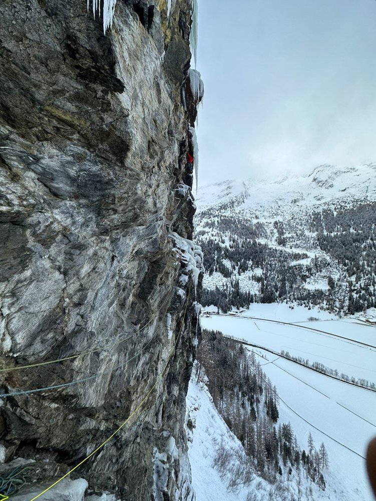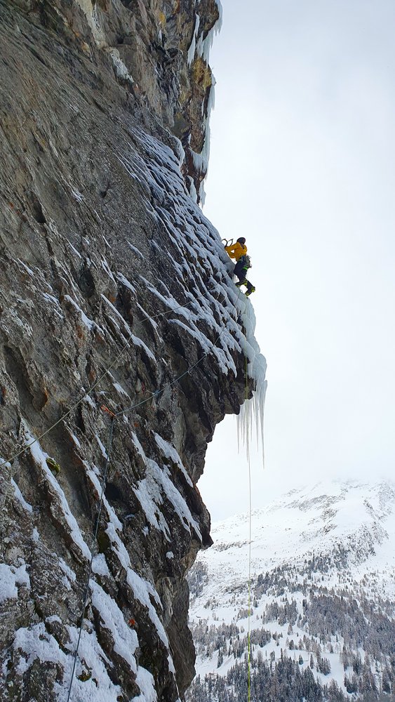 Bei "Zirmol" handelt es sich um eine irrsinnig steile Linie durch frei hängende Eiszapfen, gefrorenes überhängendes Gras und sandigen Fels, wie geschaffen für die ganz großen Pecker als Absicherung. Die Linie braucht einiges an Gespür für den einfachsten Weg, es stecken aber nun 13 Haken, die die Orientierung erleichtern und die Tour zu einer Art "Trad-Plaisir-Route" machen. Der Fels und die Graspolster sollten für eine sichere Begehung unbedingt irgendwie zusammengrefroren sein.