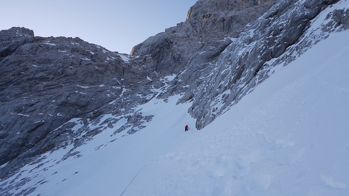 Wer eine Talfahrt mit der Bahn plant, für den ist ein sehr früher Aufbruch unbedingt ratsam. Im Dunkeln dabei den richtigen und leichtesten Weg durch den Felsvorbau unterhalb des bayerischen Schneekars zu finden ist nicht ganz leicht, daher empfiehlt sich eine helle Stirnlampe und vorheriges genaues Studium der Bilder und Zustiegsbeschreibungen (vgl u.a. auch Zustiegsbeschreibung "Direkte Nordwand" und "Himmel und Hölle").