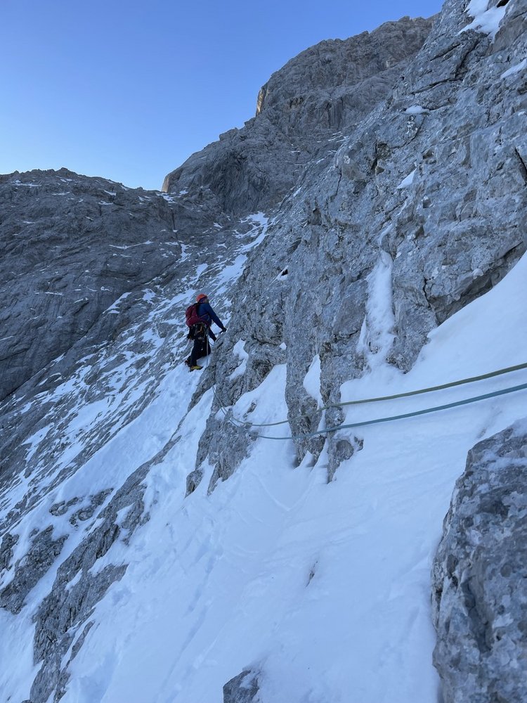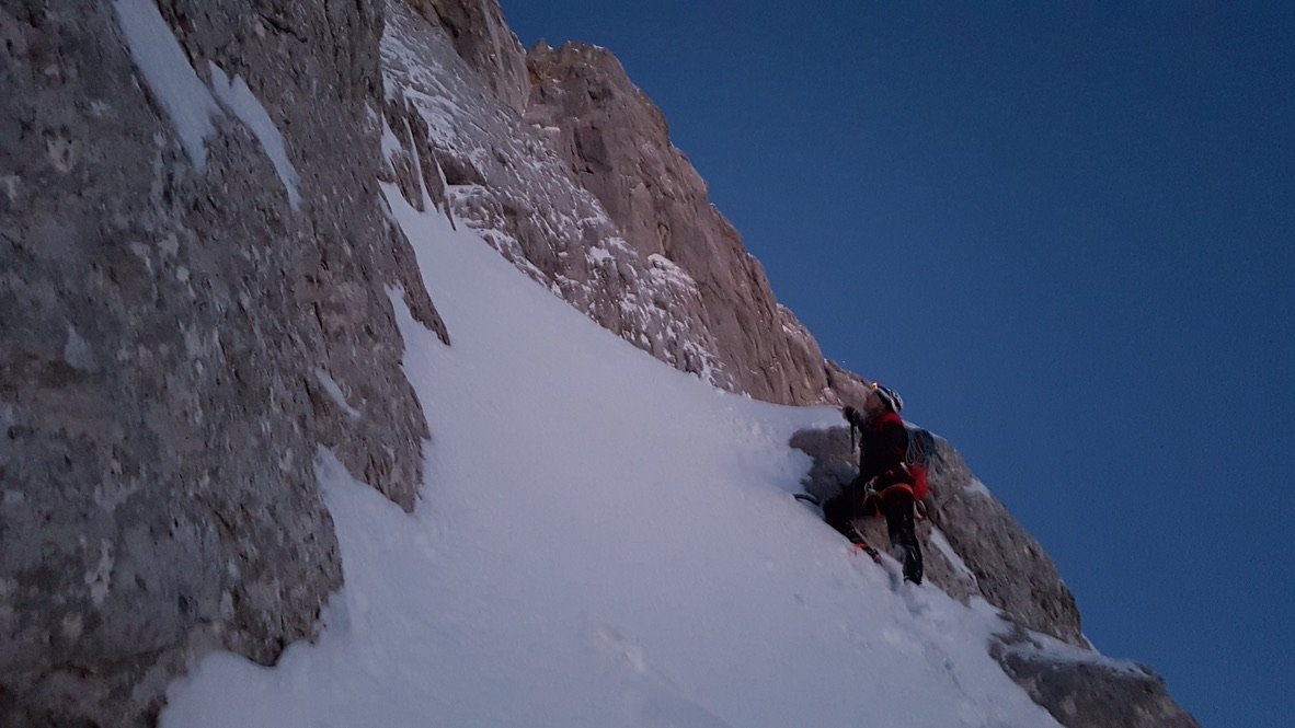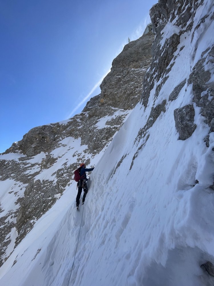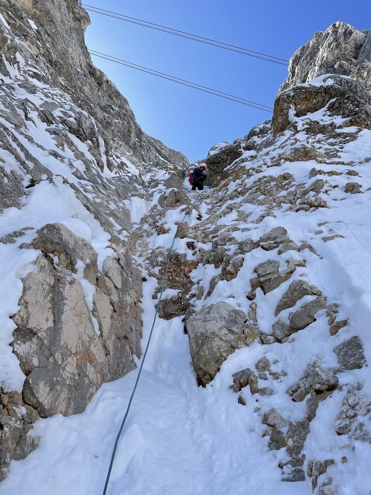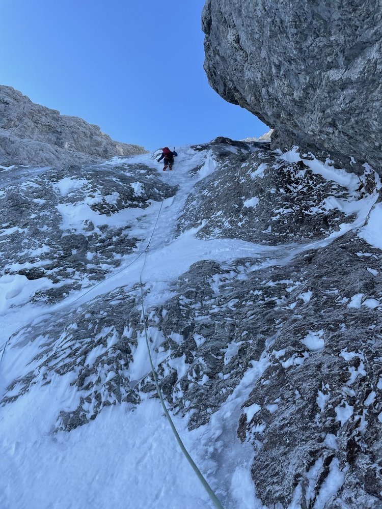 Nun beginnt die ca. 3 Seillängen lange Kletterstrecke bis zum Ausstieg. Je nach Schneelage und Schneekonsistenz mit mal mehr oder weniger Klettermetern und Schwierigkeiten, Fels hier eher brüchig.