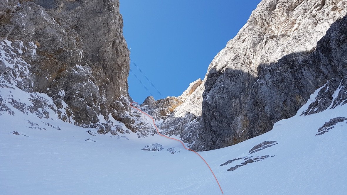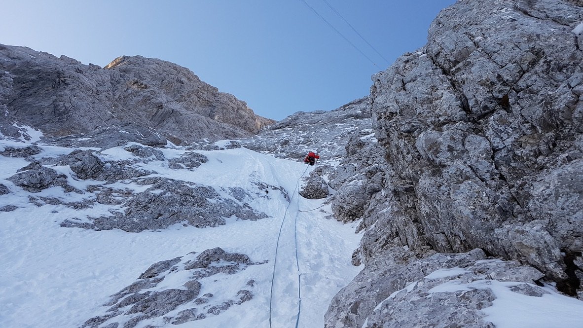 3. Seillänge: links vom Stand in eine Rinne und diese recht einfach (sofern Schneeerfüllt) empor bis zu einem weiteren Sticht-BH kurz vor Beginn des Schneebandes des Seilbahnquergangs.