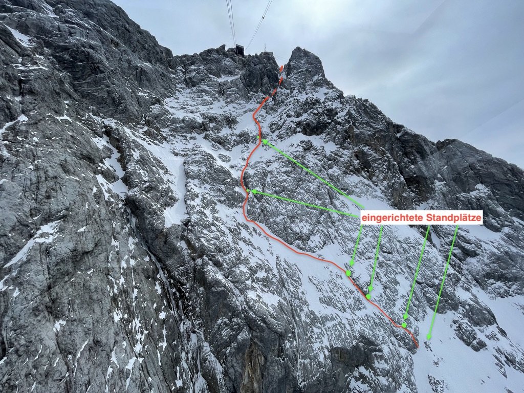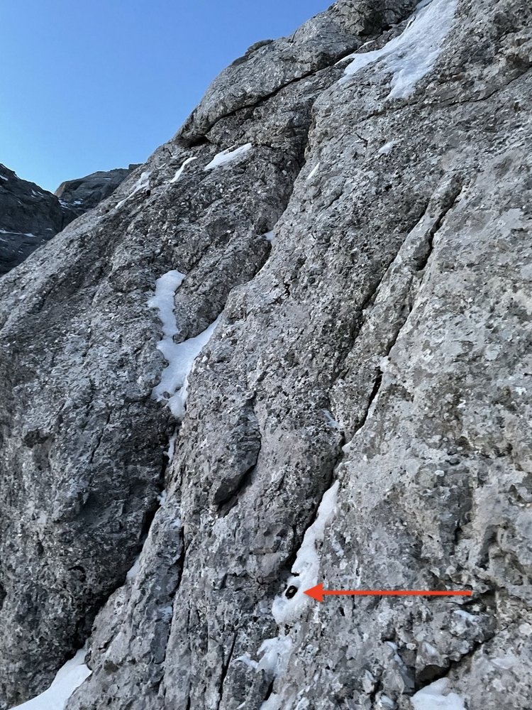 - Anmerkung: Laut Routenbeschreibung der "Direkten Nordwand" kommt man im Seilbahnquergang auf Höhe Einmündung dieser Route in den Quergang nochmals an einem Standplatz mit NH und Sticht-BH vorbei. Ebenso befindet sich wohl ein Sticht-BH im Seilbahnquergang kurz vor Abzweig in das Couloir hinauf zum Eisfall. Laut Routenbeschreibung der Direkten Nordwand befindet sich nach 15m im Couloir hier ein Stand mit 2 Normalhaken. Bei der Begehung vom 29.4.22 konnte im Seilbahnquergang und auch hinauf zum Eisfall keiner dieser Stände gefunden werden, bei jedoch damals eher noch guter Schneelage und Neuschnee.