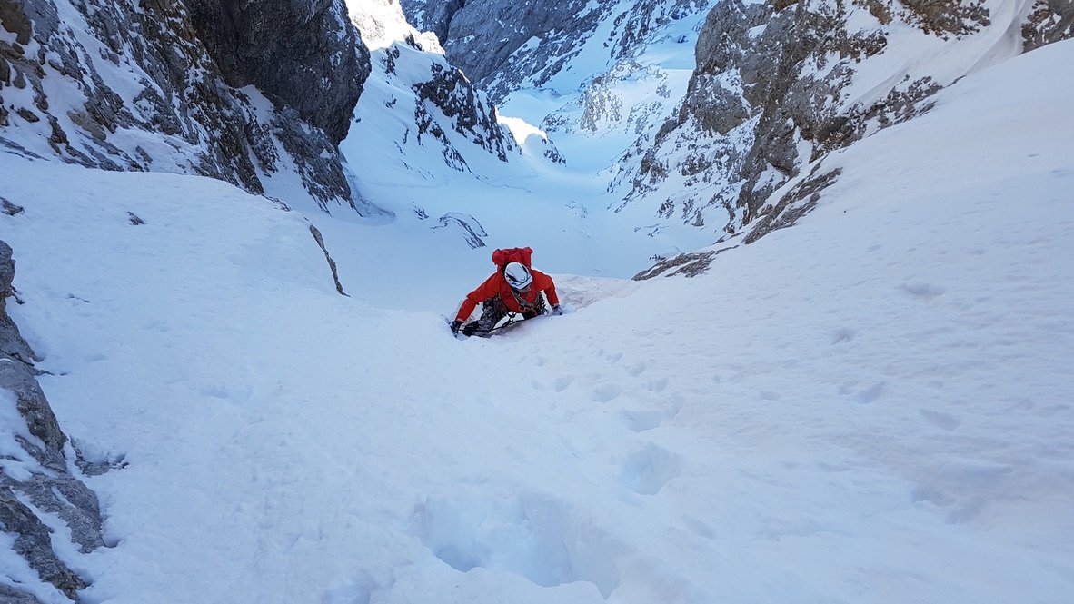 Ganz rechts mühsam im Steilschnee und Fels (ca.M3, kaum absicherbar)über einen kleinen Aufschwung hinein in eine U-förmige Schneerinne am rechten Rand. Weiter diese empor und Stand rechts in den Felsen (selbst einzurichten, Normalhaken, Friends).