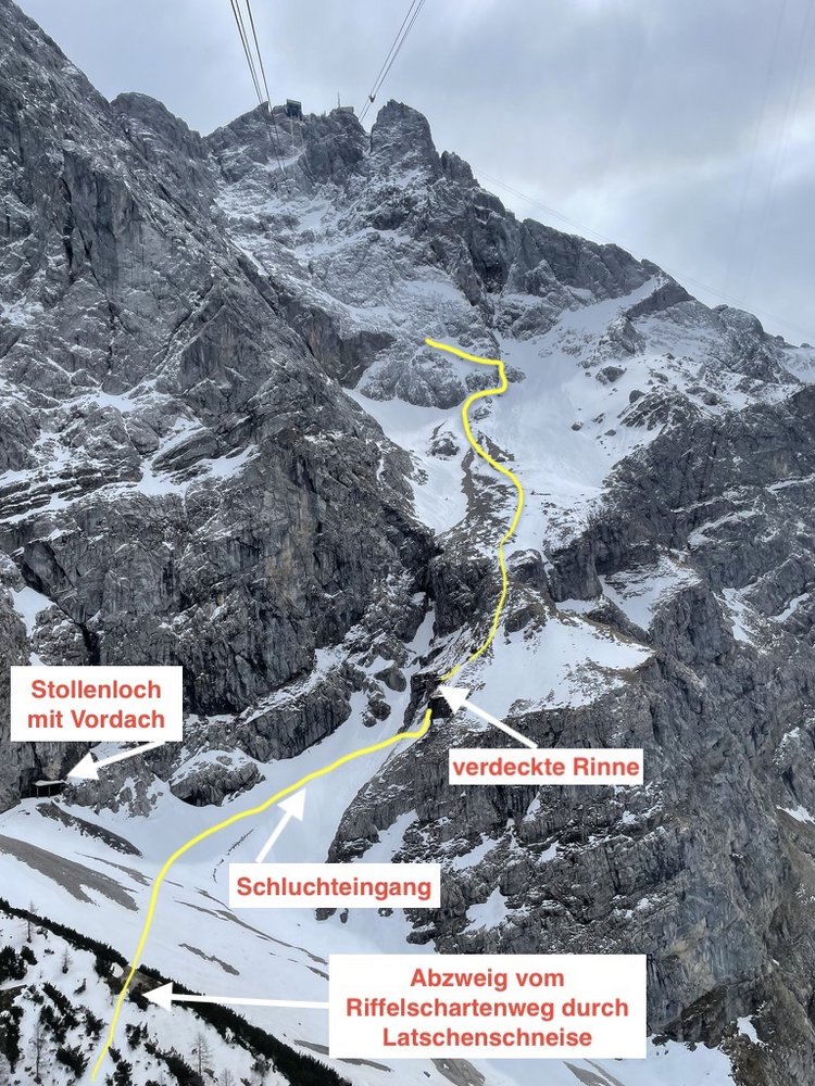 Vom oberen Parkplatz der Eibsee Zugspitzbahn (1010 m) zur Haltestelle Riffelriß (1638 m). Weiter auf dem Wanderweg Richtung Riffelscharte bis zu einer offensichtlichen Schneise in den Latschen auf ca. 1800 m. Dort den Weg verlassen und nach rechts ins Geröll-/Schneefeld queren. Unterhalb des Stollenlochs (markantes Vordach) in Richtung der offensichtlichen, felsigen Schlucht queren die vom bayerischen Schneekar herunterkommt. Diese Schlucht jedoch nicht aufwärt nach hinten ersteigen. Auf der rechten (bzw. orographisch linken) Seite zu Beginn der Schlucht nützt man eine Schwachstelle des Felssockels (ca. 1830 m) um diesen zu erklettern (nach rechts ansteigend im Schnee/Gras und dann kurze grasig-felsige Rinne mit leichter Kletterei (vgl. Übersichts-Bilder, Steigeisen/Eisgerät angenehm). Weiter einfach auf dem Rücken des Felssockels hinauf zum Bayerischen Schneekar.