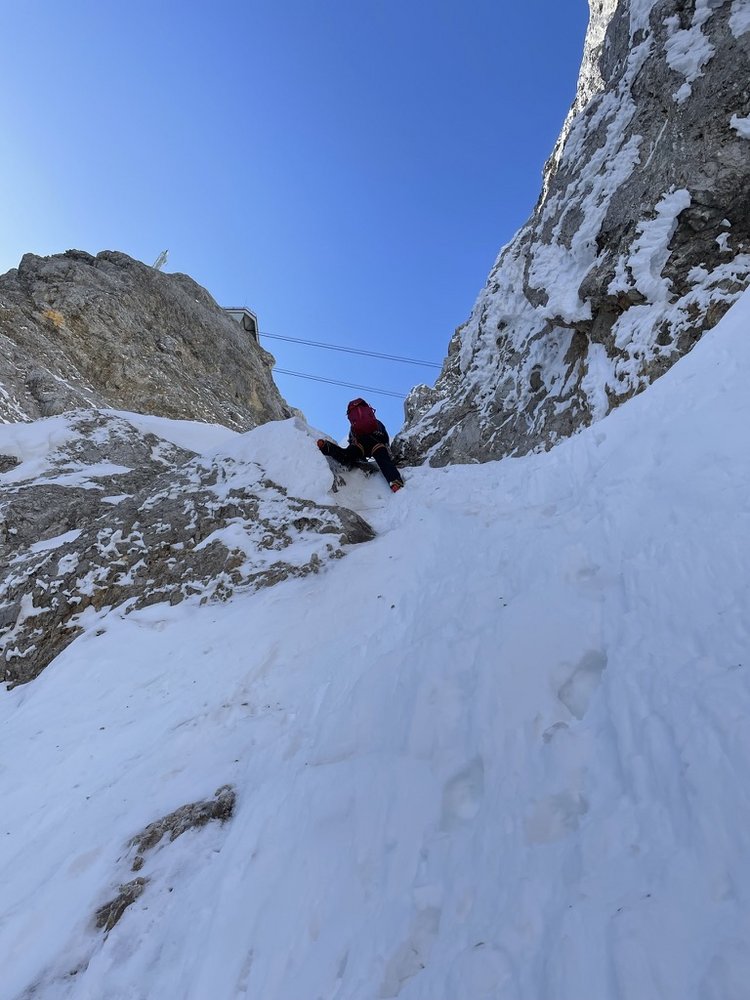 Die Linie ist als kombinierte Winterkletterroute zu verstehen und stellt eine schöne, sehr lohnende und dabei sicherere Nordwandrouten-Alternative zur benachbarten Tour "Himmel und Hölle" dar. Dabei wird von der Route "Himmel und Hölle" deren oberer (höllischer)Anteil gemieden (heikel, anspruchsvoll zum absicheren, schwer) und der untere gut kletterbare und absicherbare (himmlische) Anteil mit genutzt. Der Mittelteil der hier beschriebenen Route (Abzweig aus Seilbahnquerung, Eisfall und Weiterweg bis Ausstiegscouloir) lässt sich ebenfalls ausreichend absichern und angenehm klettern und ist hier identisch mit der Route "Direkte Nordwand" von Fritz Miller. Das lange Ausstiegscouloir hinauf zur Tiroler Zugspitzbahnbergstation ist konditionell nochmals fordernd, bietet aber je nach Schneelage nur wenige Mixed-Kletterstellen und wurde daher auch schon bei sehr guten Schneeverhältnissen 2018 mit Ski befahren (Routenname: " 1. Mai"). In dem großen Ausstiegscouloir zum Westgipfel/Tiroler Zugspitzbahn ist eine gute, aber vorallem verfestigte Schneelage von Vorteil. Bei zuviel lockerem Neuschnee wirds hier vermutlich unangenehm, bei zu wenig Schnee kommen hier evtl. weitere brüchige Felsstufen hervor.