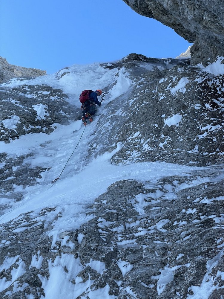 Die abschließende Seillänge ist nicht mehr schwer. Zuerst am linken Rand des Couloirs durch eine vereiste Rinne (M2) empor und dann wieder ansteigend nach rechts queren und rechterhand aus dem Couloir aussteigen auf ca.1900m. Im Ausstiegsbereich verlaufen alte Stahlseile und Eisenstangen, an welchen Stand bezogen werden könnte bei Bedarf.