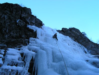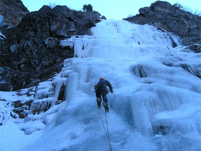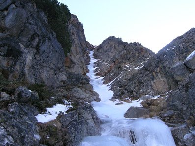 Schöner Eisfall, bei dem meist nur die erste Seillänge gemacht wird - der Rest (ca. 100 - 120m) ist flach und liegt großteils unterm Schnee. Der Fall ist gut mit dem Linken Zwingenfall (selber Einstieg in der Schlucht; 3 SL. WI 3+; WI 2 und WI 5) kombinieren.