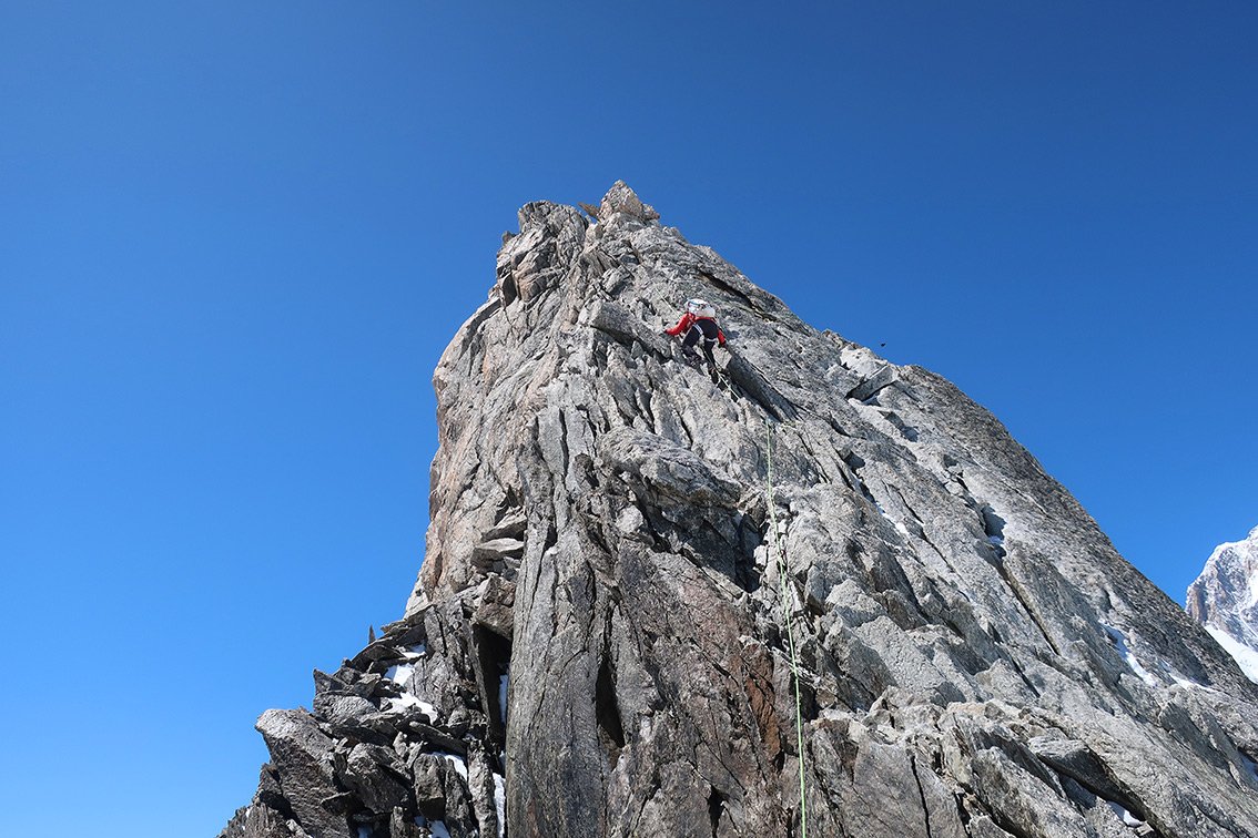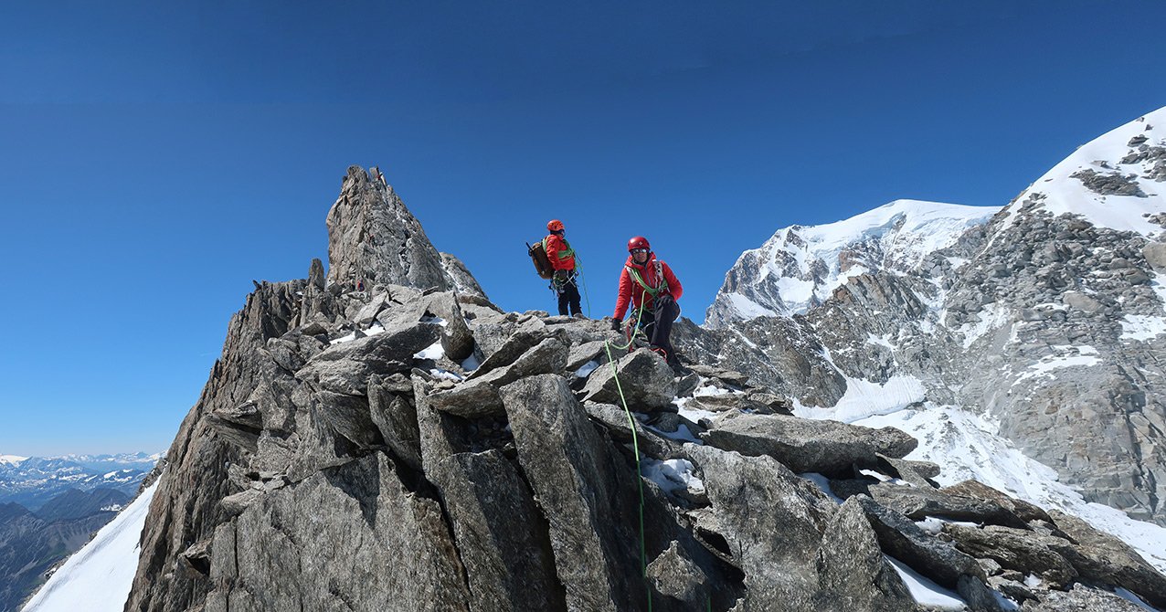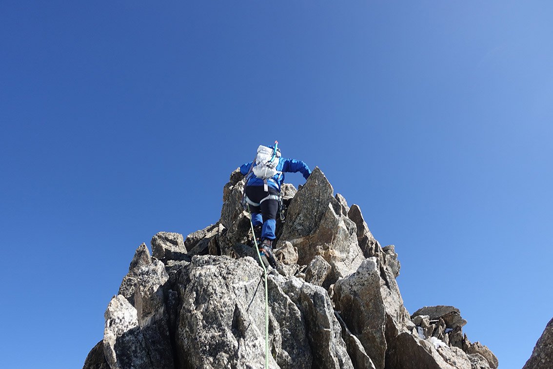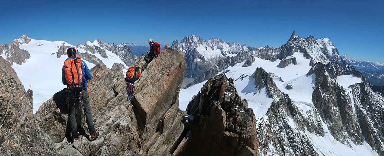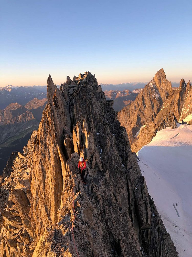 Die Überschreitung der Aiguille d'Entrèves ist eine der beliebtesten Grattouren im Mont Blanc Massiv. Eine geniale Halbtages-Gratklettertour von der Torinohütte. Die Aiguille d´Entreves eignet sich perfekt zum Akklimatisieren oder einfach zu ein bisschen entspannt Grat-kraxeln. Beim Klettern hat man immer die bekannten Kletterzapfen um den Grand Capucin und die mächtige Brenvaflanke mit dem Mont Blanc im Blick.