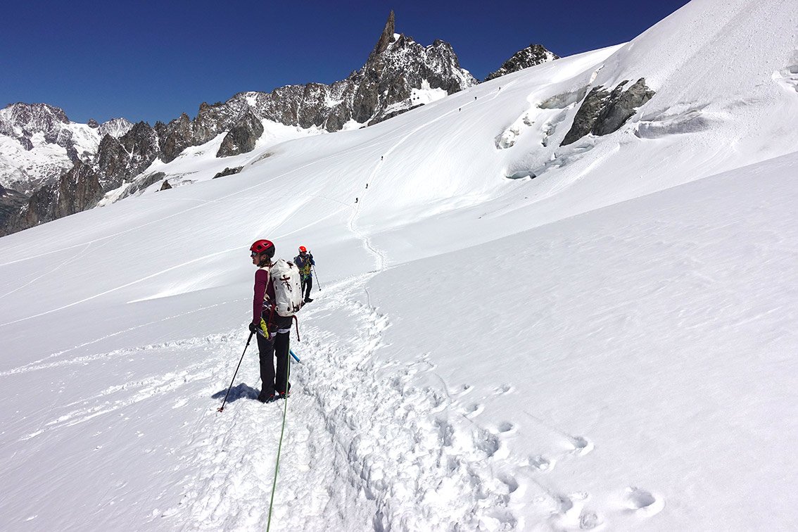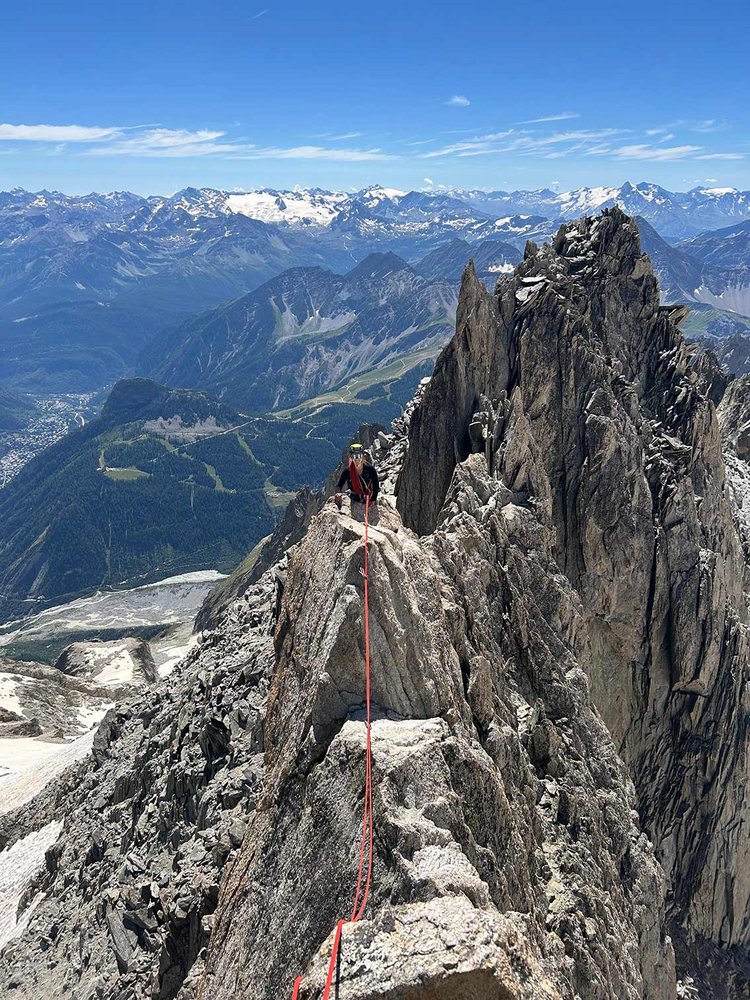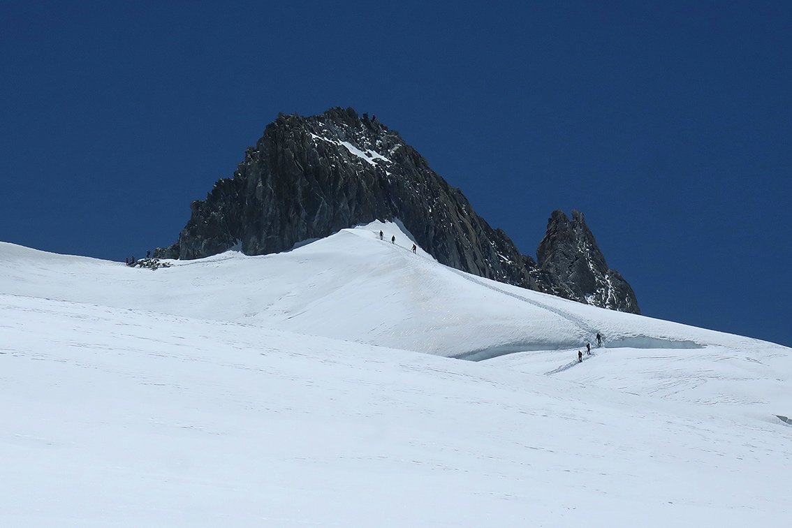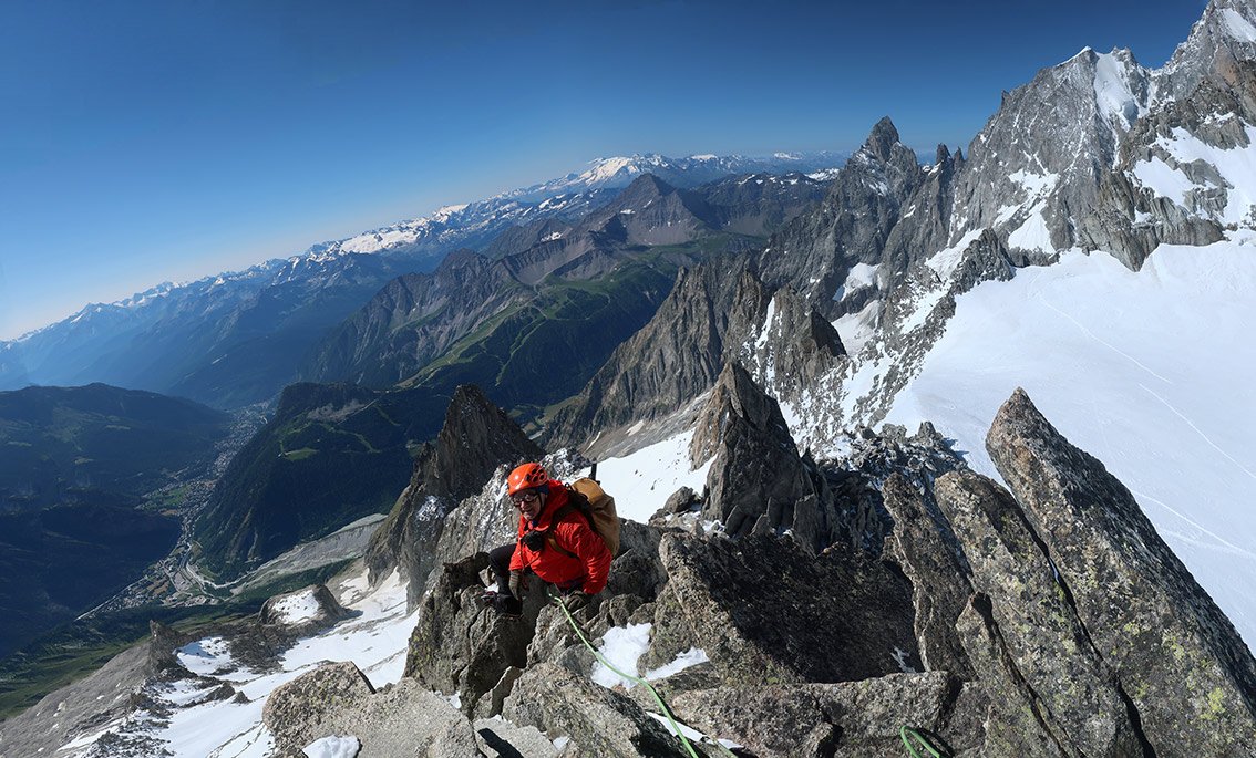 Die Überschreitung der Aiguille d'Entrèves ist eine der beliebtesten Grattouren im Mont Blanc Massiv. Eine geniale Halbtages-Gratklettertour von der Torinohütte. Die Aiguille d´Entreves eignet sich perfekt zum Akklimatisieren oder einfach zu ein bisschen entspannt Grat-kraxeln. Beim Klettern hat man immer die bekannten Kletterzapfen um den Grand Capucin und die mächtige Brenvaflanke mit dem Mont Blanc im Blick.