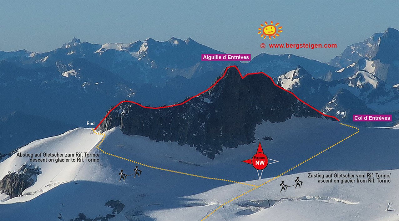 Vom Rifugio Torino auf dem Gletscher nördlich von Grand Flambeau und Aiguille de Toula vorbei und dann unterhalb des Entreves-Grates zum Col d'Entreves aufsteigen. Je nach Möglichkeit auf den Grat. Immer auf dem anfangs leichten Grat bleiben (ein Turm wird umgangen) bis man zum sogenannten Fotopoint (steile Schuppe) kommt, dort wird das Gelände schwieriger. Vom Fotopoint westlich eine Rinne hinunter, unten auf einem Band zu Rinne mit oben sperrenden Klemmblock. Oberhalb des Blockes auf dem Grat weiter (diverse Bohrhaken) bis zur 2 Meter hohen Schlüsselstelle (ca. 5+, ist aber gut technisch möglich). Über den Aufschwung (mit Riss) aufwärts und weiter auf dem Grat bis zum Abseilpunkt. Dort abklettern oder 2 x 25 bis 30 m kurz abseilen. Weiter abwärts, zuerst westlich vom Grat, dann wieder auf dem Grat zu flachem Gelände. Auf diesen nach Norden, ein steiler Aufschwung wird südöstlich umgangen, bis man am Ende gestuft hinunter zum Gletscher absteigt.