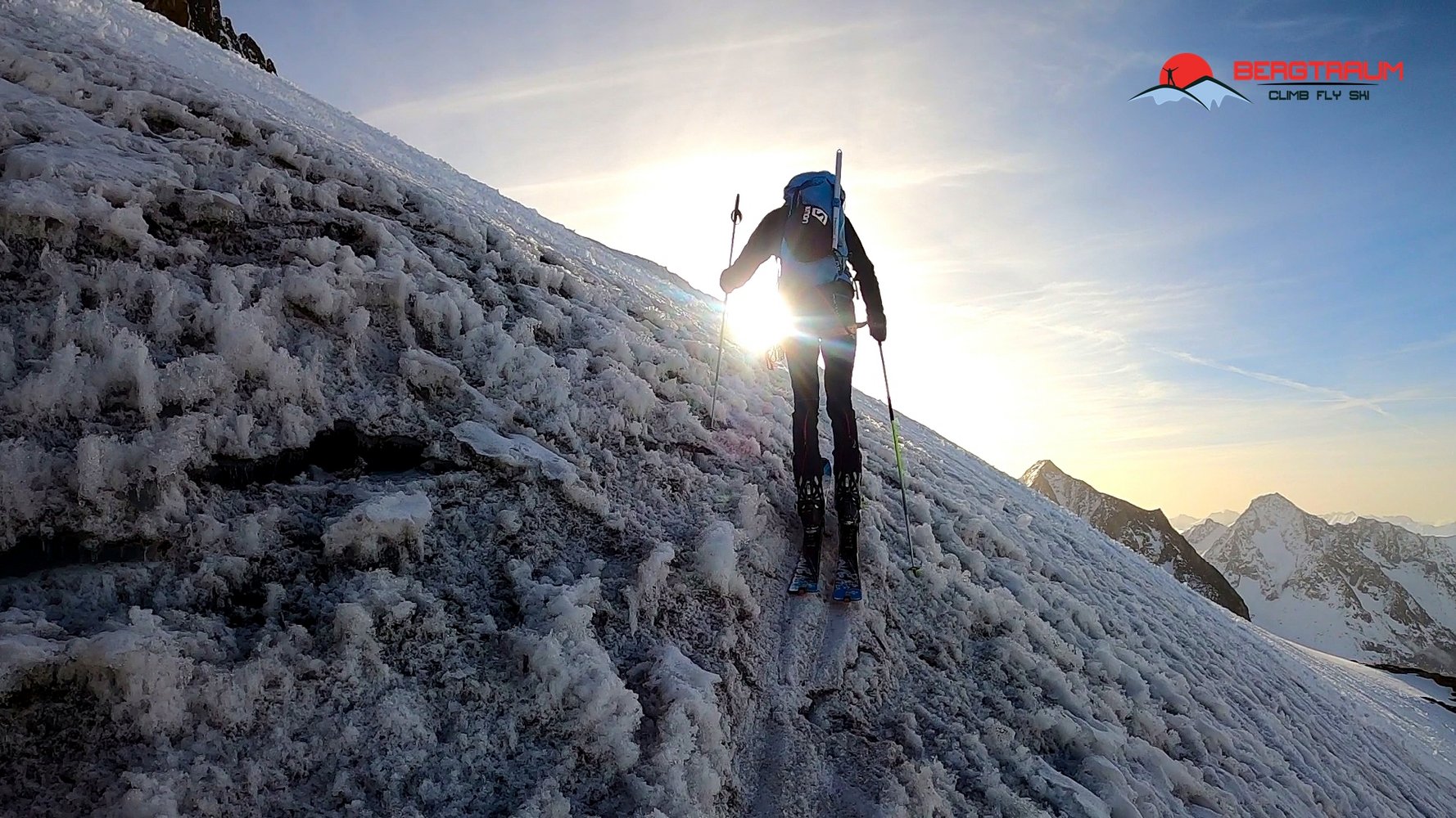 Der finale NW- Grat kann bei viel Schnee ab dem Hugisattel anspruchsvoll werden. Zum Hugisattel rauf ist es recht steil- bei Neuschnee die Lawinengefahr nicht unterschätzen. Bei sehr viel Schnee kann manchmal direkt vom Hugisattel nach Westen zum Fieschergletscher abgefahren werden (viele Spalten!).