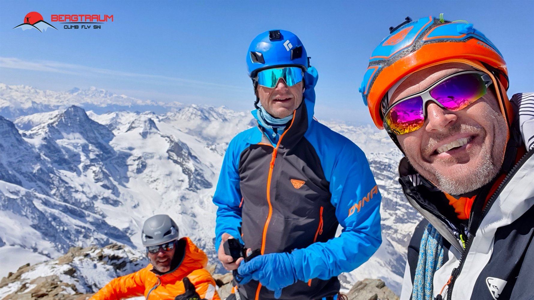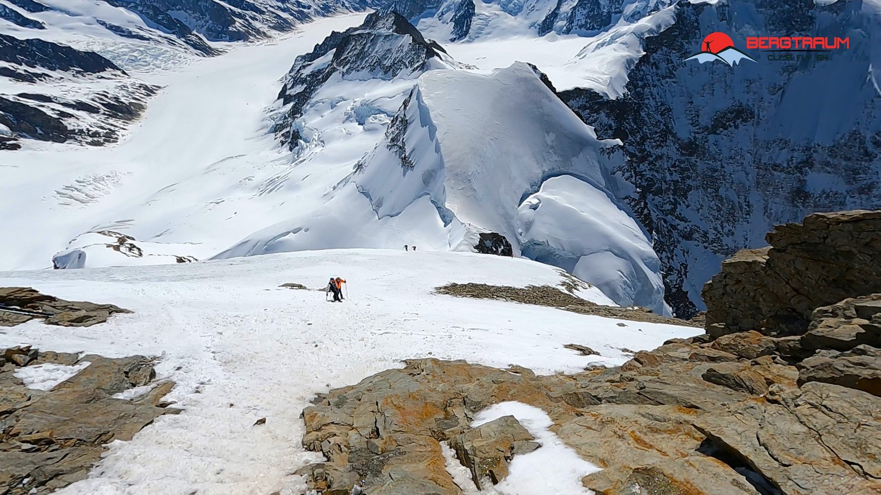 Beschreibung: Von der Konkordiahütte (2.850 m) anfangs die 150 Hm über die Stahlleitern runter zum Gletscher. Den langen Jungfraufirn Richtung Nordwesten flach aufwärts bis unter den Rottalsporn. Am beginn des Sporns kurz westlich, dann markant steil Richtung Norden über Schnee und Fels (SG bis II) aufwärts. Den Rottalsporn nun entlang Richtung Westen unter dem Rottalhorn hindurch zum Skidepot (ca. 3.800 m) unterhalb des Rottalsattel. Nach Überwindung der Randkluft zum Sattel (3.885 m) und weiter sehr steil und ausgesetzt über Schnee und Eis Richtung Gipfel. Die letzten 50 Hm über unschwieriges Felsgelände zum Endpunkt (4.158 m).