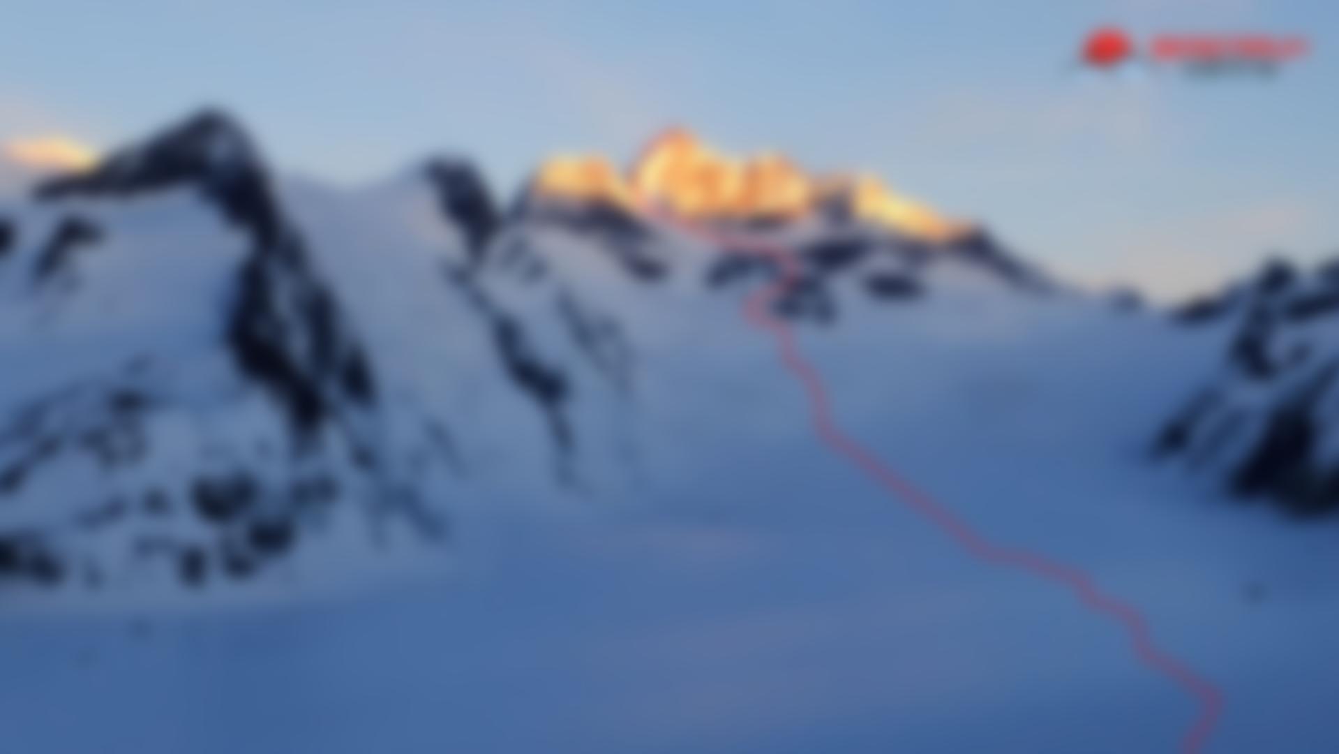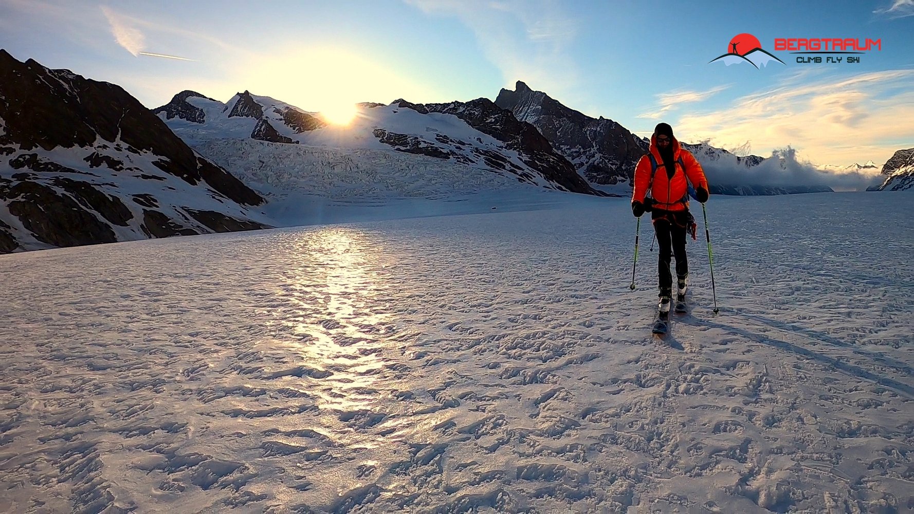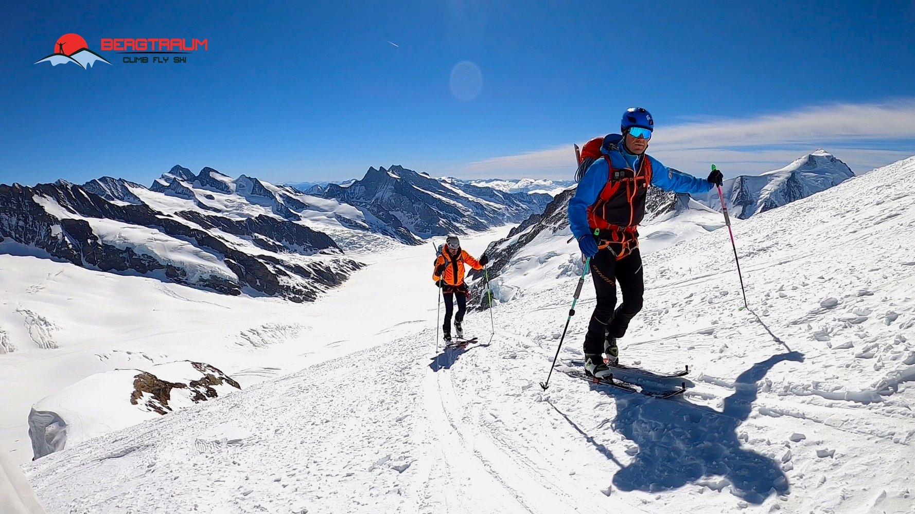 Entlang der Aufstiegsroute wieder hinunter. Beim Skidepot entweder dem Aufstiegsweg folgen, oder direkt markant steil über die Nordostflanke runter. Dort zwischen zwei Eisbrüchen ins darunterliegende Gletscherbecken abfahren. Weiter Richtung Ost und orografisch links der Spaltenzone vorbei, bis man auf die Spuren des Normalweges trifft. Kurzer Anstieg zum Jungfraujoch hinauf.