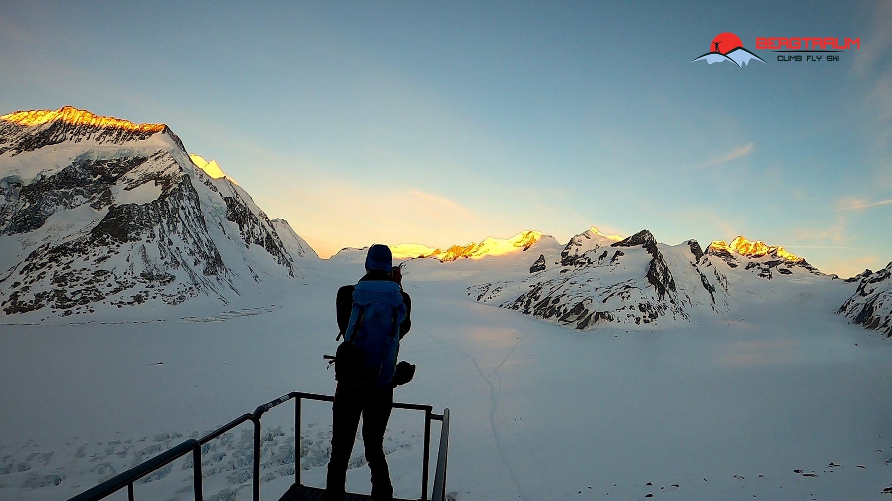 Zustieg bis Konkordiahütte: bequem und schnell vom Jungfraujoch (1 Std)- Ausgang Sphinxstollen (3464 m).Über den Jungfraufirn südostwärts auf den Konkordiaplatz hinunter und über die weite Fläche an seinem Ostrand zum Skidepot der Hütte (ca. 2700 m) am Fuss der Metallleitern. Über die Metallleiter zur Hütte (ca. 150 Hm).