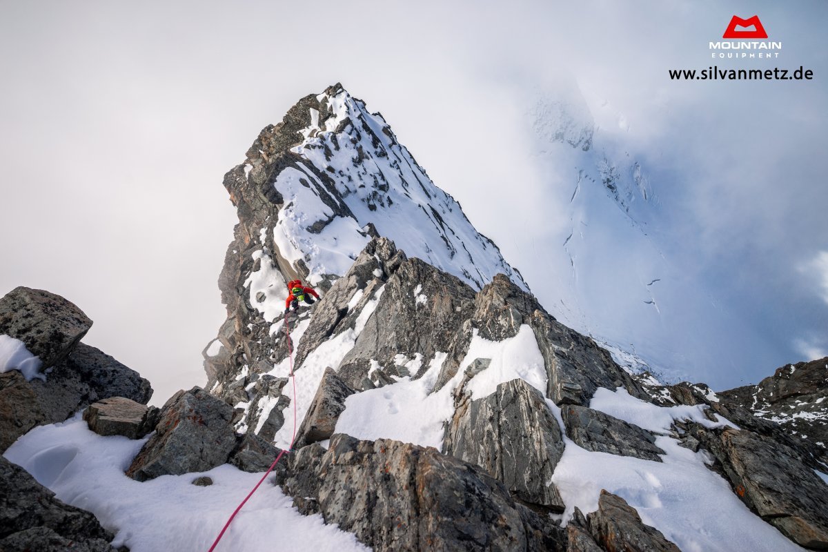 Jenseitig hinab in den Firnsattel und mehr oder weniger direkt an der Gratkante hinauf (III+), bis ein langes einfaches Stück folgt. Am Ende von diesem nach links in eine gut sichtbare Rinne/Rampe. Diese hinauf (III+) bis an die Gratkante. Nach einer kurzen Querung auf einem Band nach rechts folgt die markante Schlüsselstelle, eine steile Verschneidung (IV+, 1 Haken). Danach zurück an die Kante und immer an ihr entlang bis zum Gipfel. Dabei wird regelmäßig der Grad III erreicht, außerdem ist eine kurze Reitstelle zu überwinden (IV, 1 Haken danach), ca 3:30h.