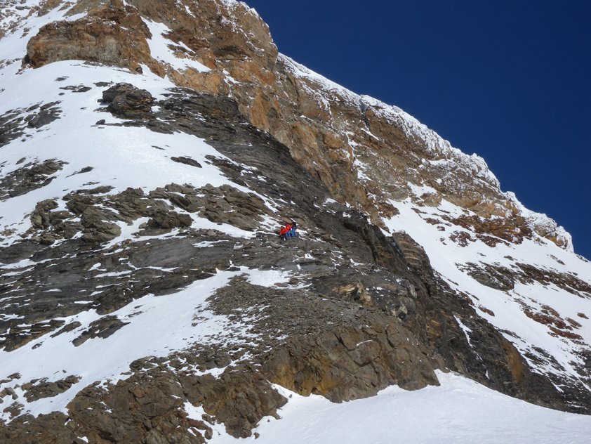 Kurze Kletterpassagen im 2ten Grad, diese sind in der Regel mit Steigeisen zu bewältigen.