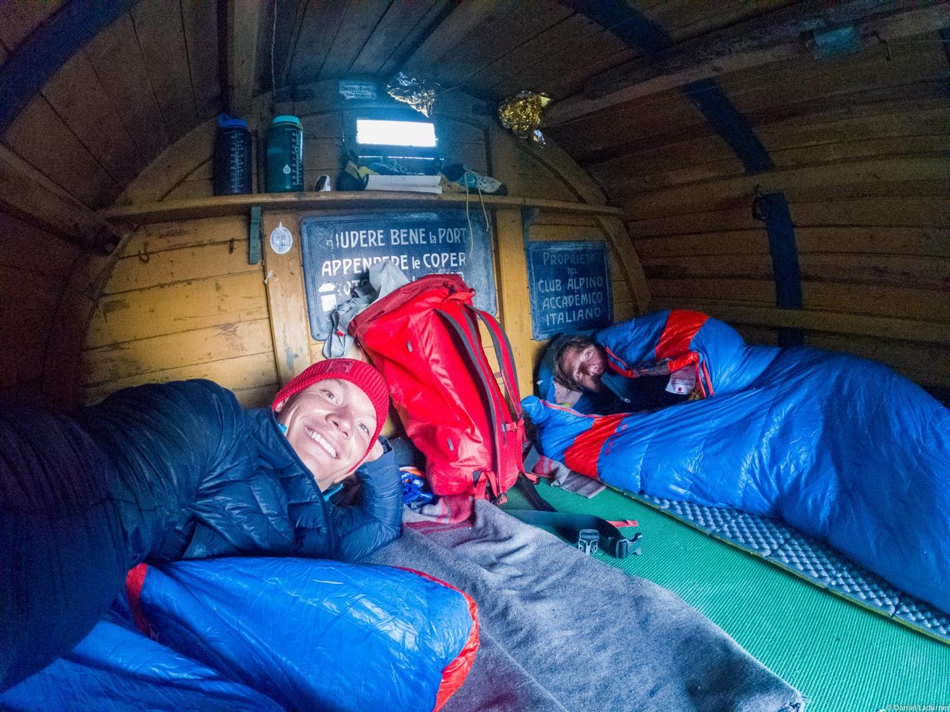 Kletterausrüstung, Helm, Cams bis BD 1, 8 Expressschlingen, Tibloc, Steigeisen, 6 Eisschrauben, 2 Eisgeräte, Schlafsack, Kocher, Isomatte, Stirnlampe und 60 m Seil