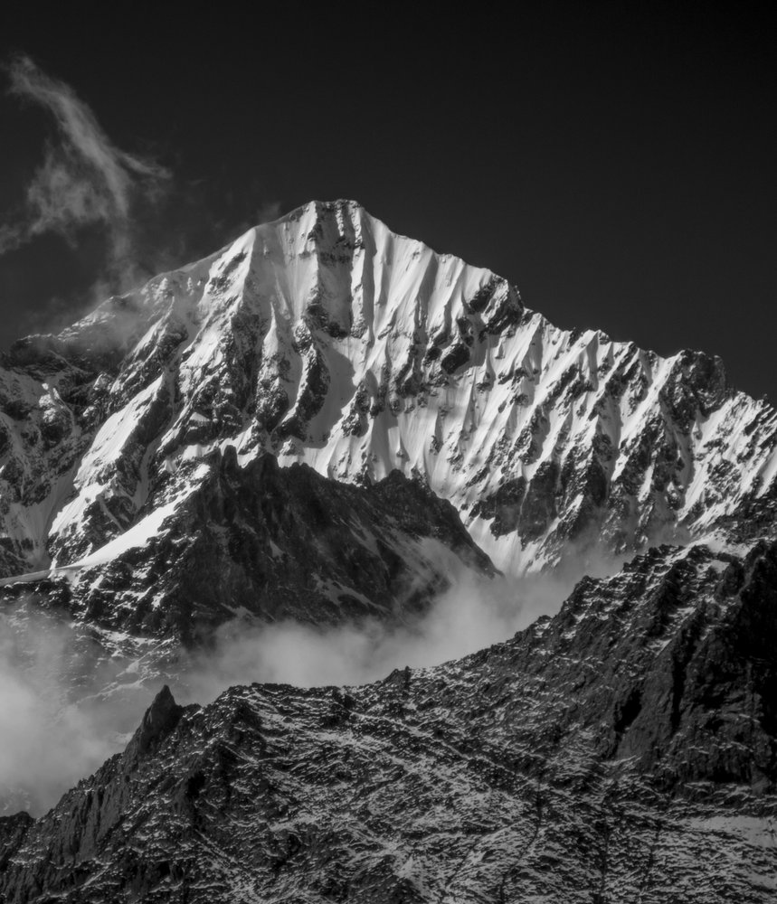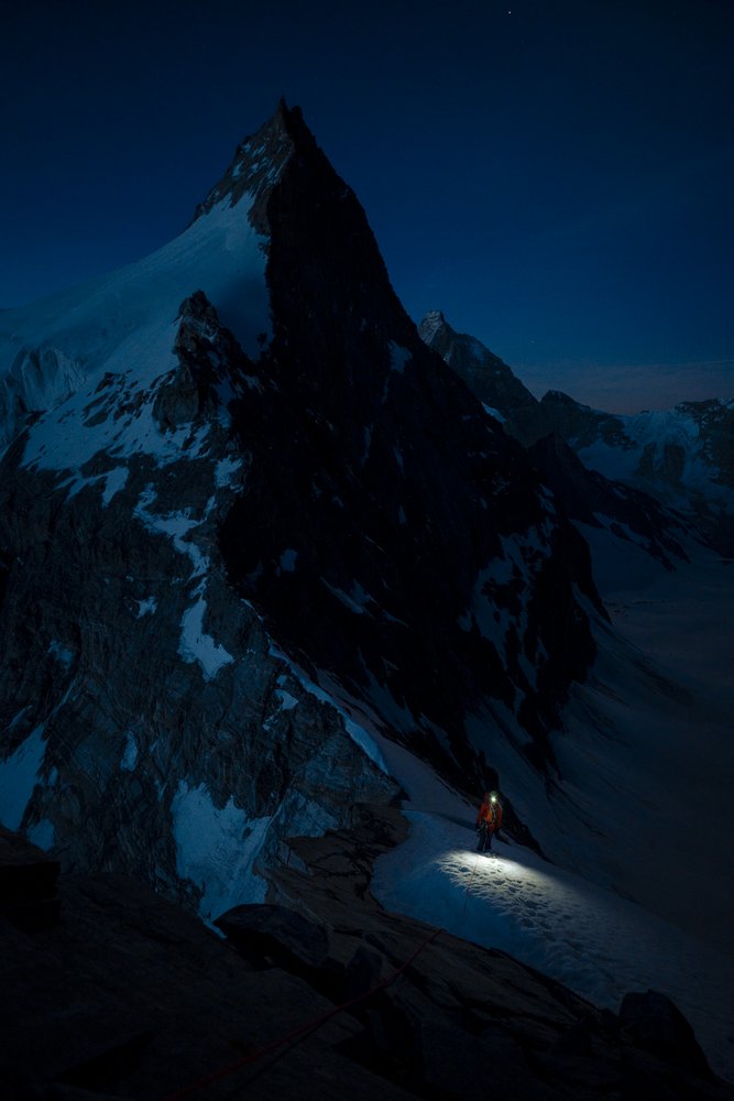 Oberer Teil: Vom Vereinigungspunkt zunächst über die vielen scharfen Zacken an der Gratkante entlang. Der erste markante Turm (ca 4070m) wird über ein offensichtliches Band und Stufen nordseitig umgangen, ein weiterer blockiger Abschnitt führt wiederum direkt am Grat zum Großen Gendarm des oberen Teils. Dieser wird so hoch wie (ohne schwerer als III zu klettern) möglich an der Nordseite gequert, bis man direkt unter dem Turm in einer Art Kessel steht. Nun nicht weiter über ein brüchiges Band queren, sondern einen markanten Kamin aus grobbrüchigen grauen Fels nach oben Klettern. Von einer Art Schulter müssen noch 15m delikater, abwärts geschichteter Fels zur Gratkante geklettert werden (III+). Weiter auf der nun oft verfirnten und schmalen Gratkante. Die Verhältnisse dominieren nun sehr die anzufindenden Schwierigkeiten. Ein markanter Steiler Turm (ca 4185) wird steil und ausgesetzt, aber gutgriffig nordseitig um- bzw erklettert (III). Weiter am Grat, bis ein großer Block den Weg versperrt (Fixfriend, guter Biwakplatz). Nicht nordseitig (Seilreste) über Bruch, sondern einige meter links des Fixfriends südseitig über gestuften festen Fels auf den Block (III). Den folgenden Aufschwung (ca 4250m) direkt an der Kante erklettern (III+, 1 Schlaghaken, teilweise brüchig). Es folgt ein letzter langer Firngrat bis zu den Gipfelfelsen, bei dem wieder die Schneebeschaffenheit über die Schwierigkeit entscheidet (zwischen Spaziergang und Hölle ist alles möglich). Immer wieder können auf der Nordseite Felsen erreicht werden, um Sicherungen anzubringen (50er Seil empfehlenswert!). Über die letzten Felsen unschwierig zum Gipfel.