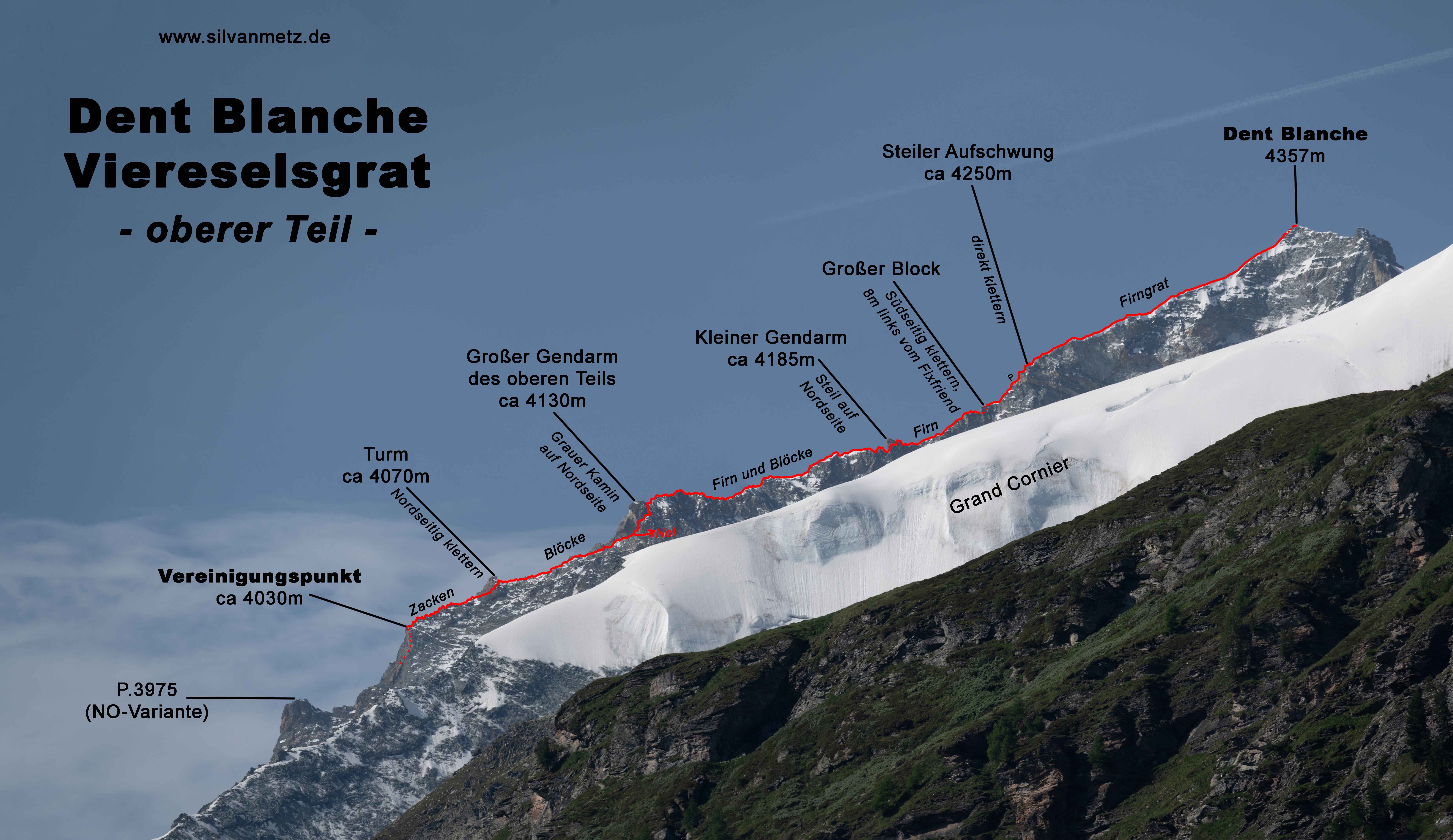 1) Direkt vom Glacier Durand durch eine von zwei offensichtlichen Rinnen auf den Nordostsporn und immer im Bereich der Gratkante zum Vereinigungspunkt (Originaler Viereselsgrat). Schwierigkeiten werden tendenziell in der Nordflanke angegangen. Keine genauere Beschreibung möglich.