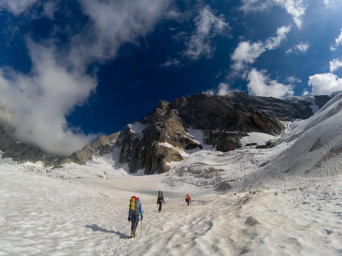 Alternativ kann man von der Pionte Walker zur Pointe Whymper queren und hier über den Felsrippe bis zur Verbindung mit dem Normalweg vor der Abseilstelle abklettern, oder im Eis orogrophisch links der Whymper Rippe zwischen dieser und den Seracs durch eine steile Rinne abklettern bis man in der Gletschermulde auf den Normalweg trifft, weiter wie oben.