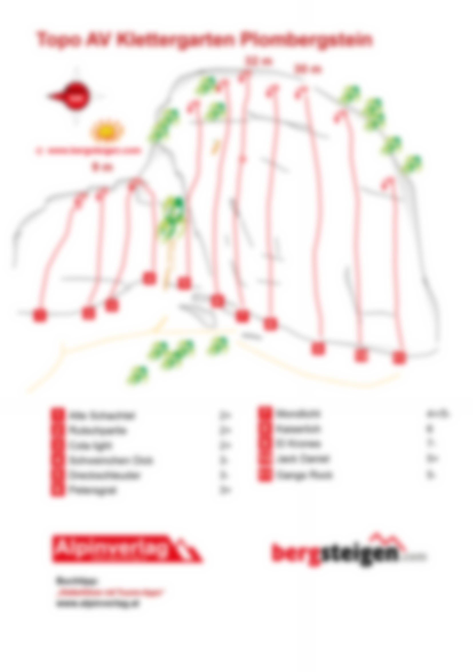 Schöner un sehr beliebter Klettergarten am Fuße des Plombergsteins. Das Routenangebot ist zwar mit 11 Touren überschaubar, aber in Verbindung mit den Baseclimbs bei der unweit entfernten Salewa oder einer Mehrseillänge durchaus lohnend. Insbesondere für Anfänger, Kinder und Kletterkurse geeignet. Die Route „Mondlicht“ hat für das Training von Mehrseillängen-Routen extra einen Zwischenstand, ansonsten braucht es aber zum Ablassen ein mindestens ein 60 Meter Seil. Alle Routen sind hervorragend mit Klebehaken abgesichert und der Fels ist mit Henkelgriffen und Sanduhren übersät. Alle Routen sind am Einstieg mit Namen und Schwierigkeitsgrad angeschrieben und am Routenende gibt es ein Ringhaken zum Ablassen oder Topropen.