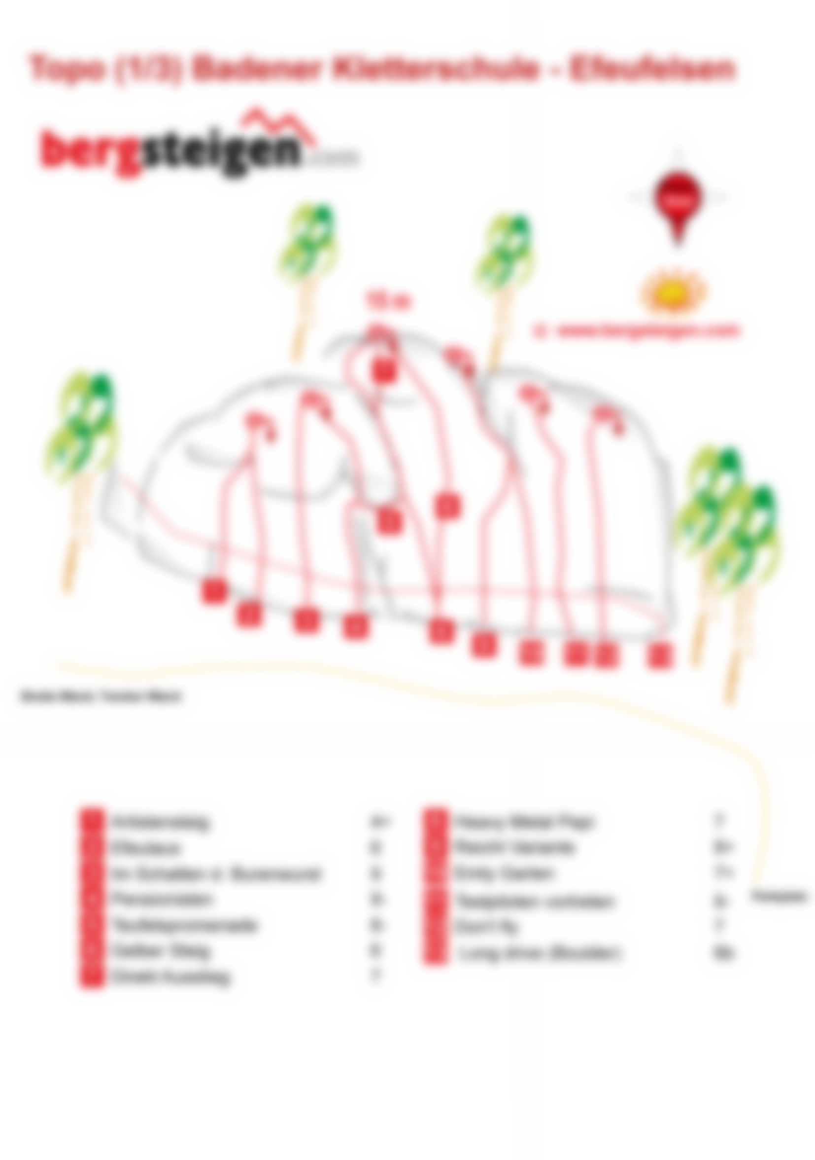 Traditionsreicher Klettergarten, der von Christian Hacker saniert und mit vielen neuen Touren ausgestattet wurde. Der Klettergarten besteht aus sechs Formationen mit unterschiedlicher Wandhöhe, wobei in der Regel am Efeufels, der Breiten Wand und der Trenkerwand geklettert wird, Rest unlohnend. Der Fels ist schon relativ abgeschmiert. Südseitige Lage, aber im Wald.