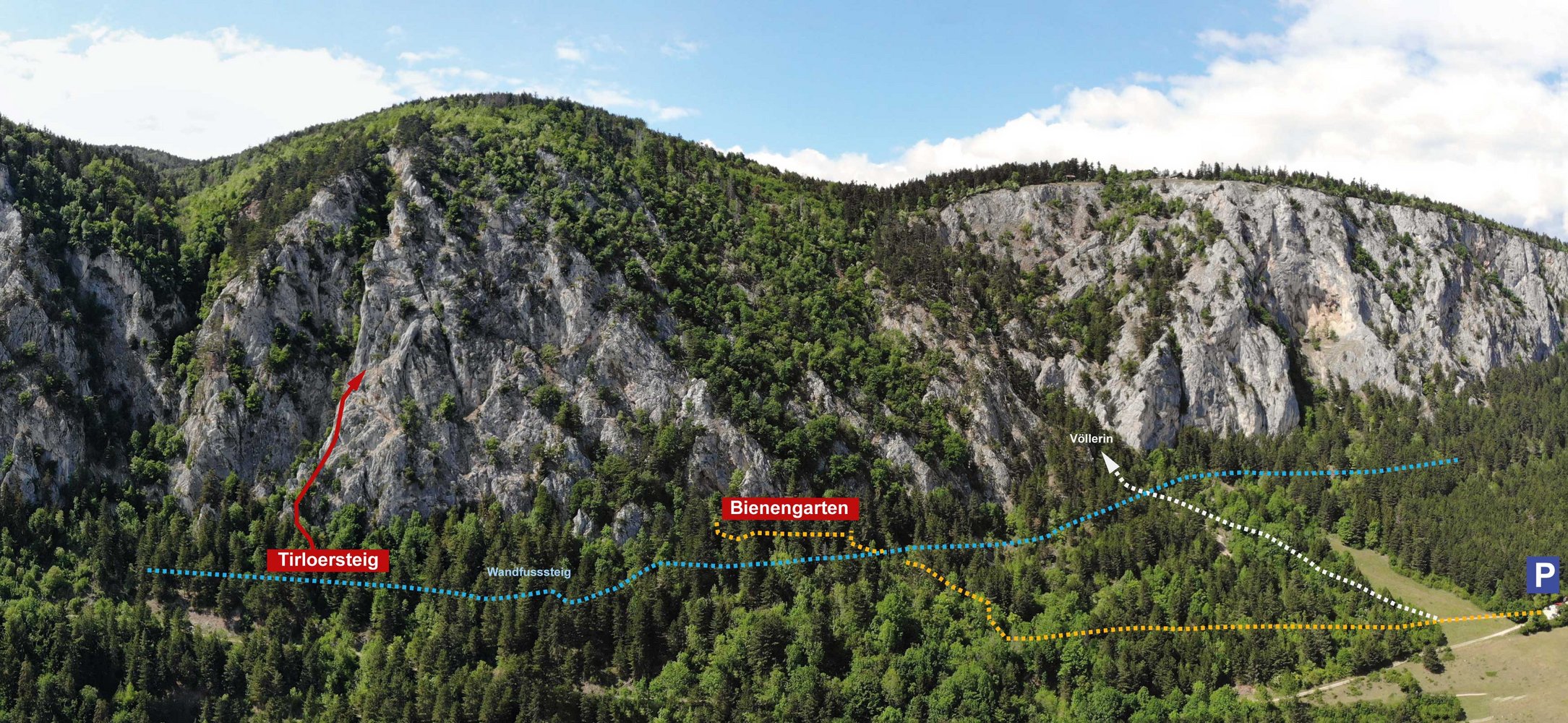 Relativ neuer Klettergarten rechts vom Tirolersteig. Fast alle Routen wurden 2023 von Thomas Behm ausgegraben und abgesichert. Man klettert an Platten aber auch an steilen Wänden und Dächern. Die leichten Routen sind eher unlohnend, besser wird es ab dem 6ten Grad. Der Einstiegsbereich ist auch im Sommer durch Bäume etwas im Schatten.