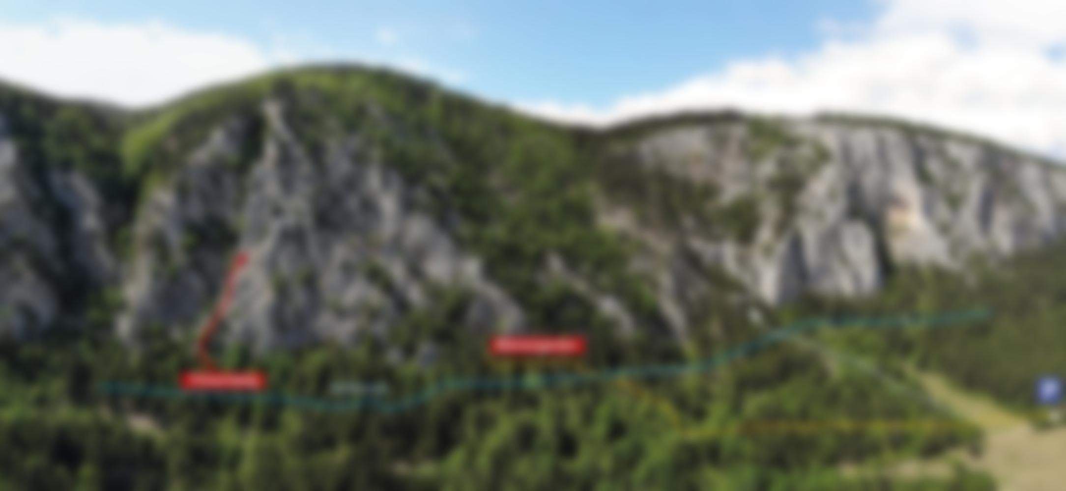 Vom Parkplatz die OBERE Forstraße nach Westen nehmen und bei der ersten Verzweigung in der Kehre auf einem kleinen Pfad zum Wandfussteig und zum Klettergarten aufsteigen.
