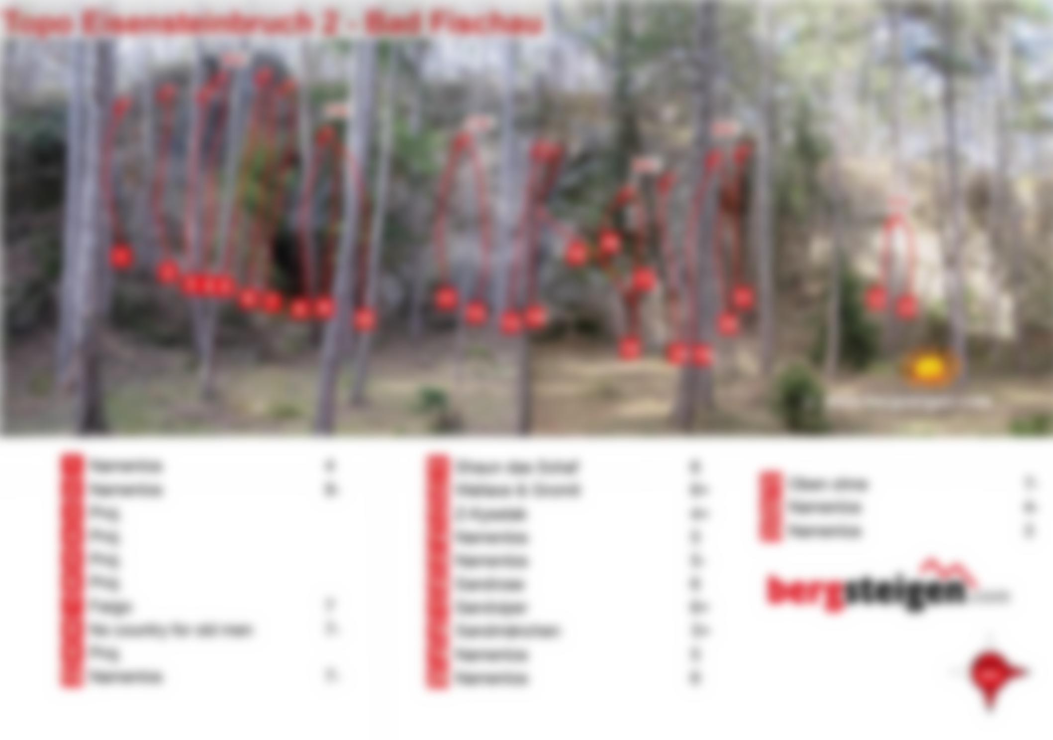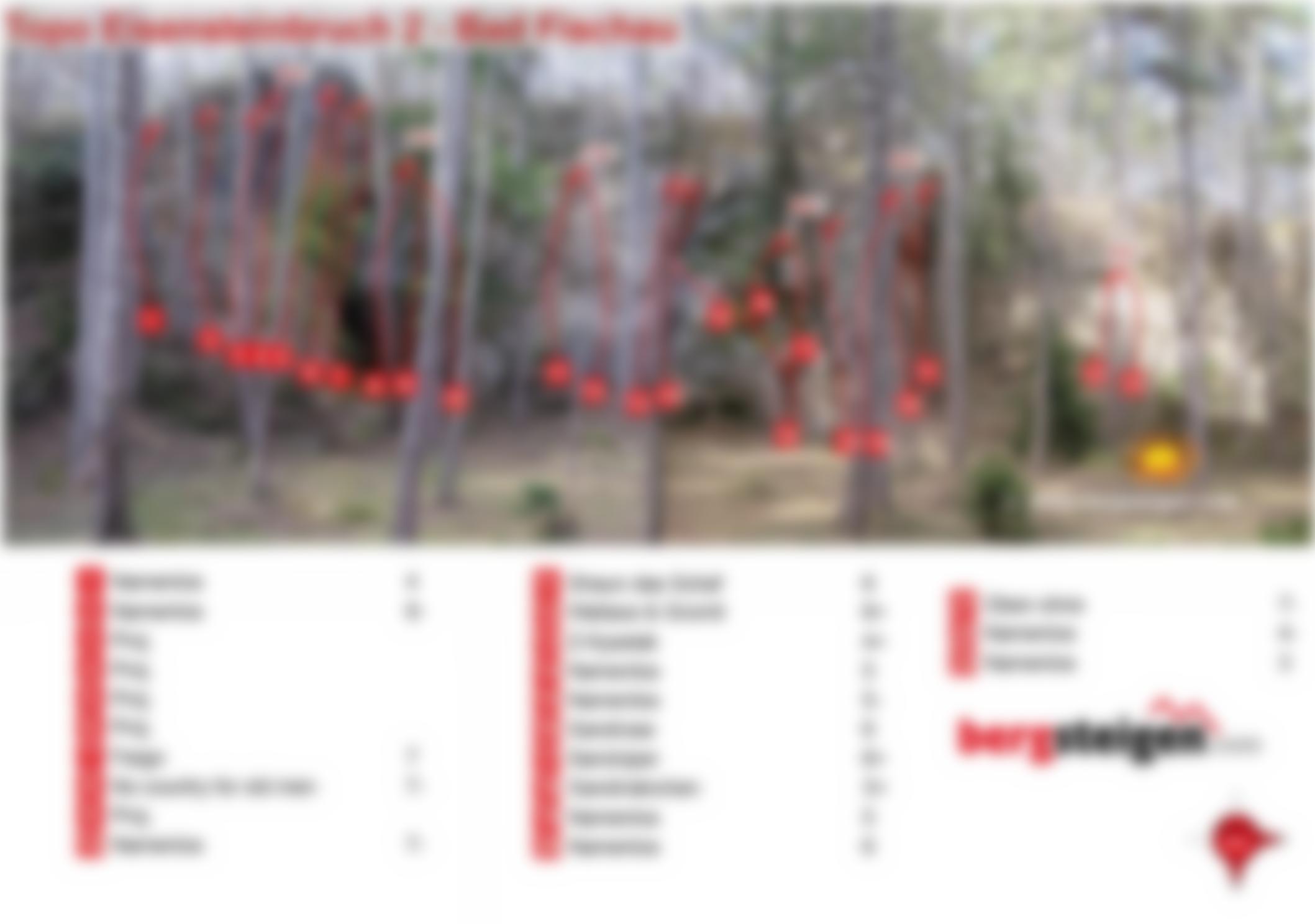 Auch im zweiten Steinbruch bei der Eisensteinhöhle wurden einige Kletterrouten eingerichtet. Die Routen sind allerdings sehr kurz und gut bis sehr gut abgesichert. Der Fels ist von guter bis leicht brüchiger Qualiät. Die Föhren spenden Schatten.