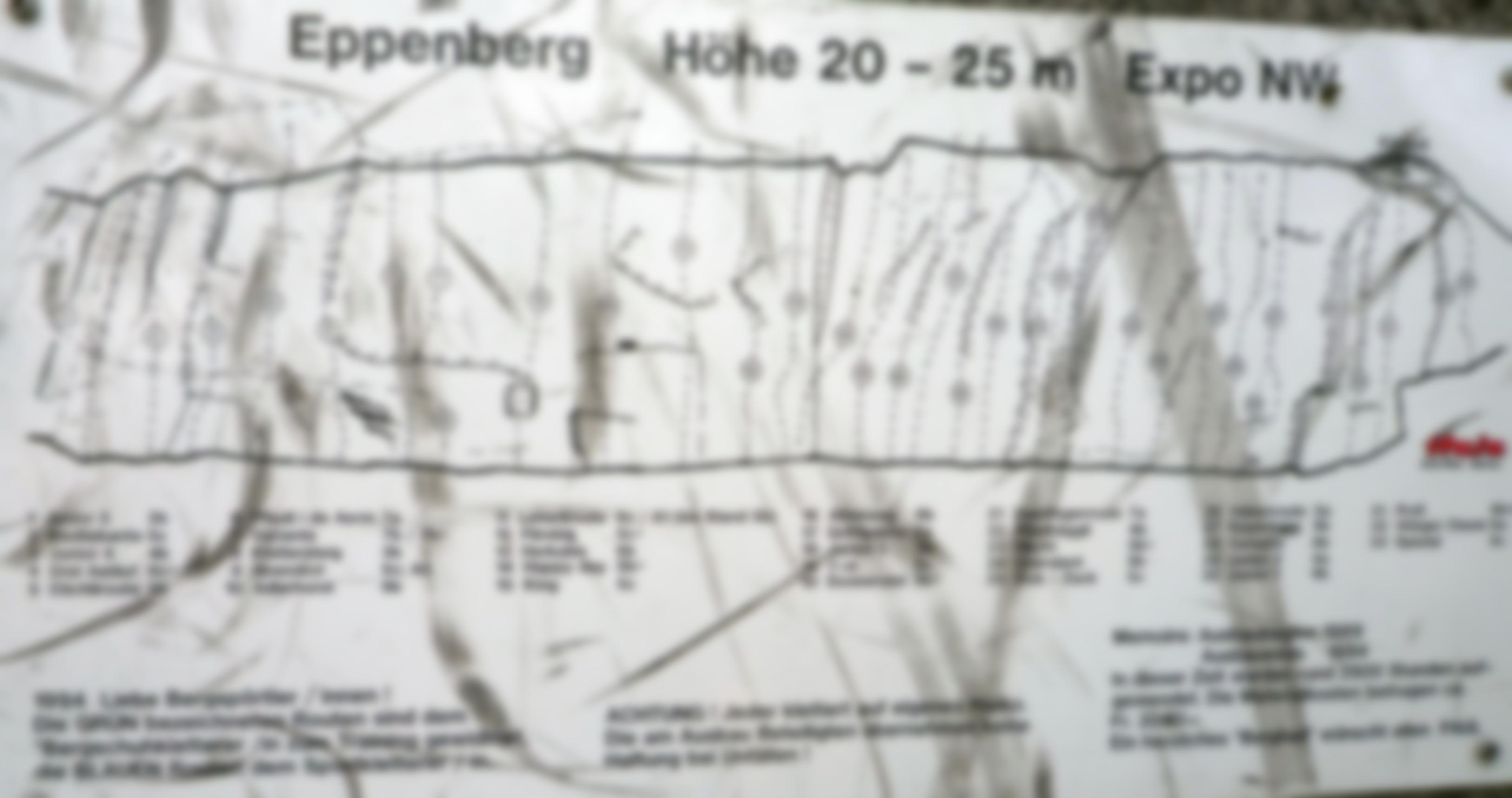 Die relativ glatten Kalkfelsen liegen schattig im Wald und bieten recht abwechslungsreiche Kletterei an Plaatten, kleinen Überhängen und steile Wandkletterei. Es gibt zwei Sektoren Eppenberg 1 und Eppenberg 2.