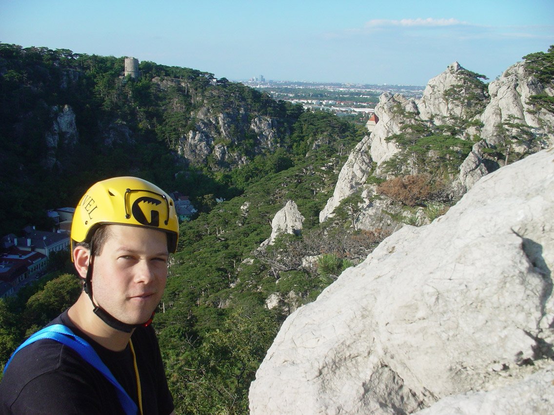 Über den Mödlingbach und in wenigen Minuten zu den Felsen. (Zweite Felsgruppe, die Eisenbänder, die den Grataufbau sichern, sind weithin zu sehen!)