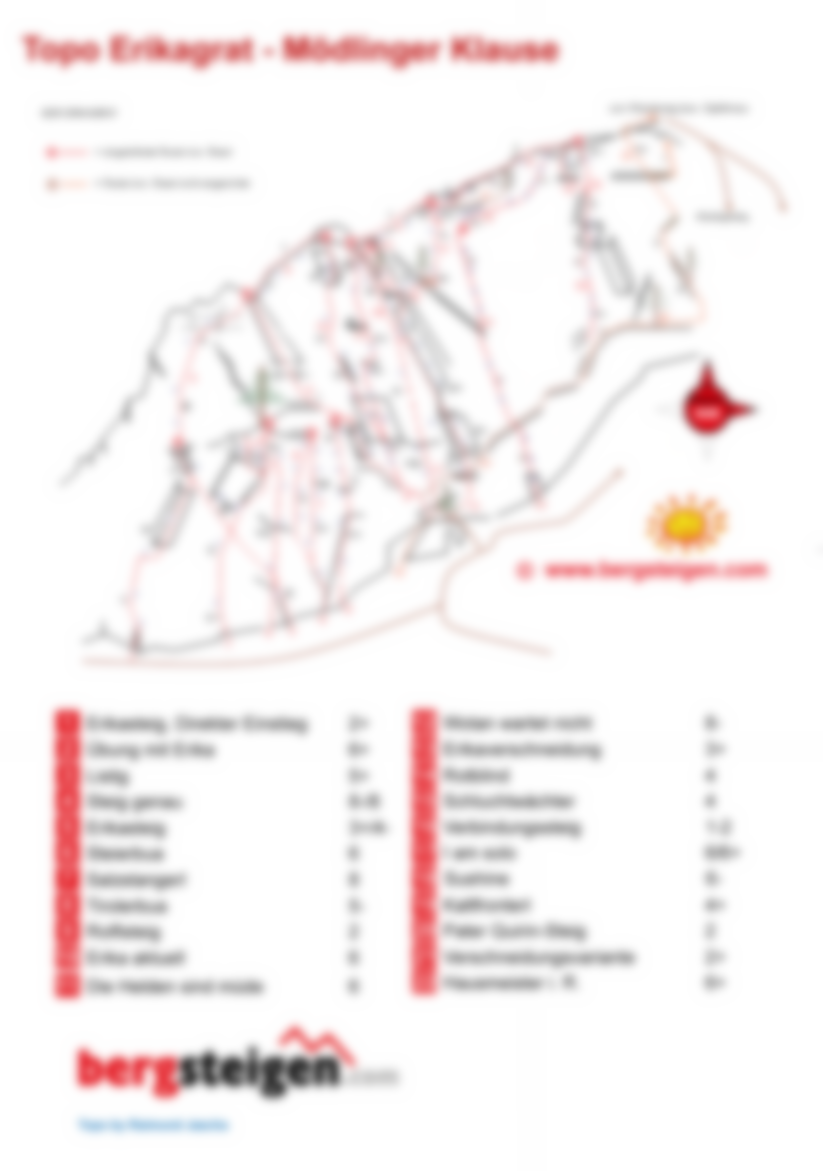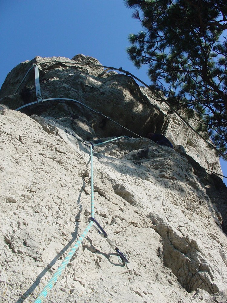 5. ERIKASTEIG III+ / IV-: 2 SL, 1. SL 27m, 2. SL 20m. Alter Klassiker, der am Ende der 2. SL auf den Eisenbändern nach rechts quert. In der Verschneidung ist ein Klebehaken gesetzt, man braucht nicht mehr Schlingen für die Eisenbänder! Vom Begehen des Orginalausstieges ( Schwarze Punkte ) wird gewarnt ( Ein Sturz landet unweigerlich auf einem der Eisenbänder )