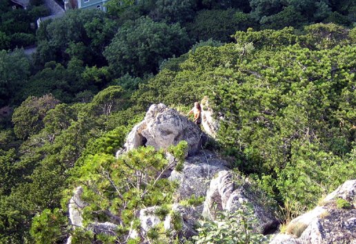 16. VERBINDUNGSSTEIG I – II: 7m, R. Jascha. Verbindet Nr. 13 und Nr. 17 zu einer logischen und sehr lohnenden 2 – SL – Tour. Stand am besten beim Baum auf dem Band beim Einstieg v. 17.; Schlinge für Baum nicht vergessen!!!