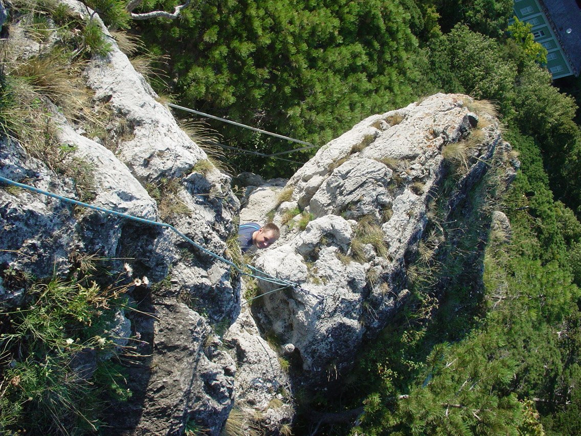 20. PATER QUIRIN – STEIG II: Alter, zumeist solo begangener Anstieg, mit orangenen Punkten markiert, im Zuge der Sanierung geputzt. Trotzdem, besonders im oberen Teil, auf brüchige Stellen achten! Bei Nässe ( Erdige Stellen! ) sollte man von einer Begehung Abstand nehmen. Einige Bandschlingen für Bäume und Latschen für Seilschaftsbegehungen mitnehmen!