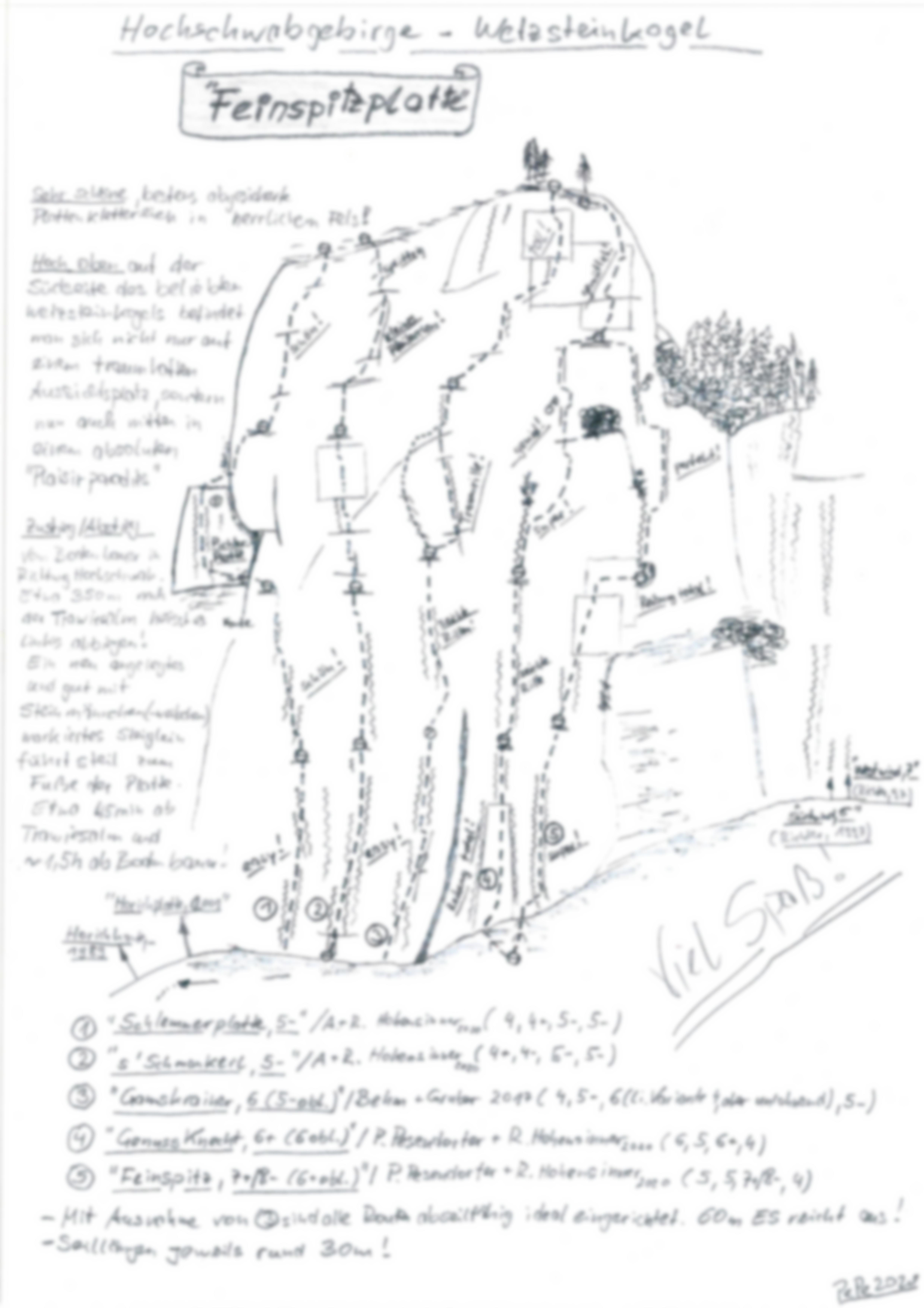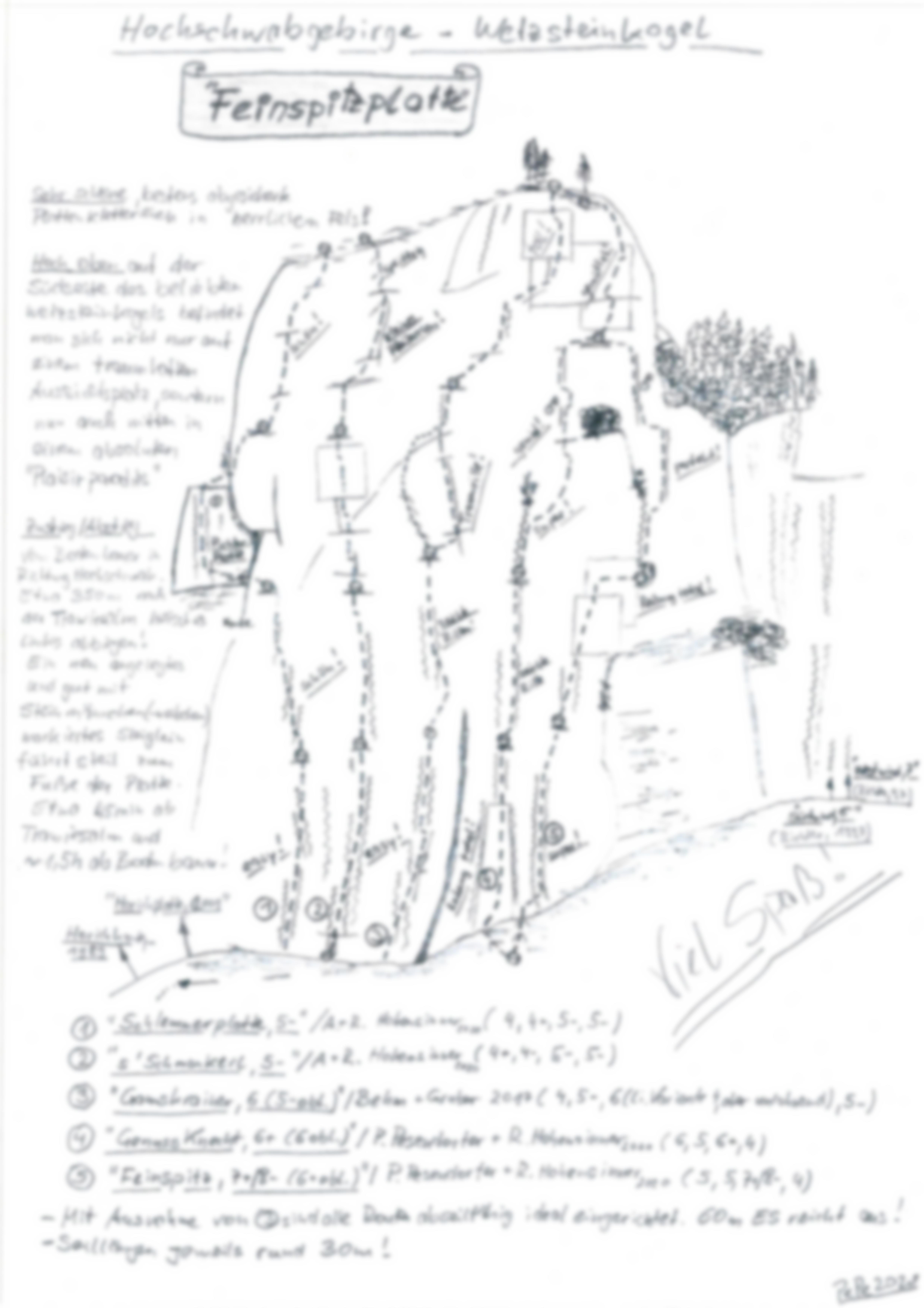 Geneigte bis maximal senkrechte Plattenklettereien in bestem wasserzerfressenen Fels. Um die Platte einigermaßen sinnvoll zu erschließen wurde ein neuer, recht gut gehbarer Zustiegssteig angelegt, und liebevoll mit Steinmännchen (- weibchen) markiert. Gut eingerichtete Standplätze und Abseilstellen ermöglichen ein Einfaches klettern mehrerer Routen hintereinander, sodass ein ausgefüllter (Platten-) Genussklettertag möglich ist. Die Routen werden von links nach rechts schwerer, und wem das noch immer nicht reicht, für den gibt es zwei weitere Sportklettertouren (Einseillängenrouten von Tom Richter) noch weiter rechts (siehe Topo). Somit warten dort oben über 20 Seillängen auf den genussorientierten Feinspitz.