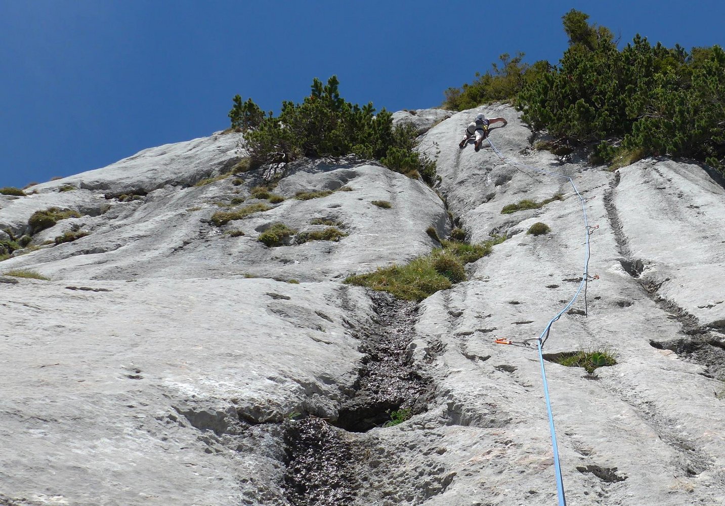 Gut mit Bohrhaken und fixen Sanduhrschlingen abgesichert.