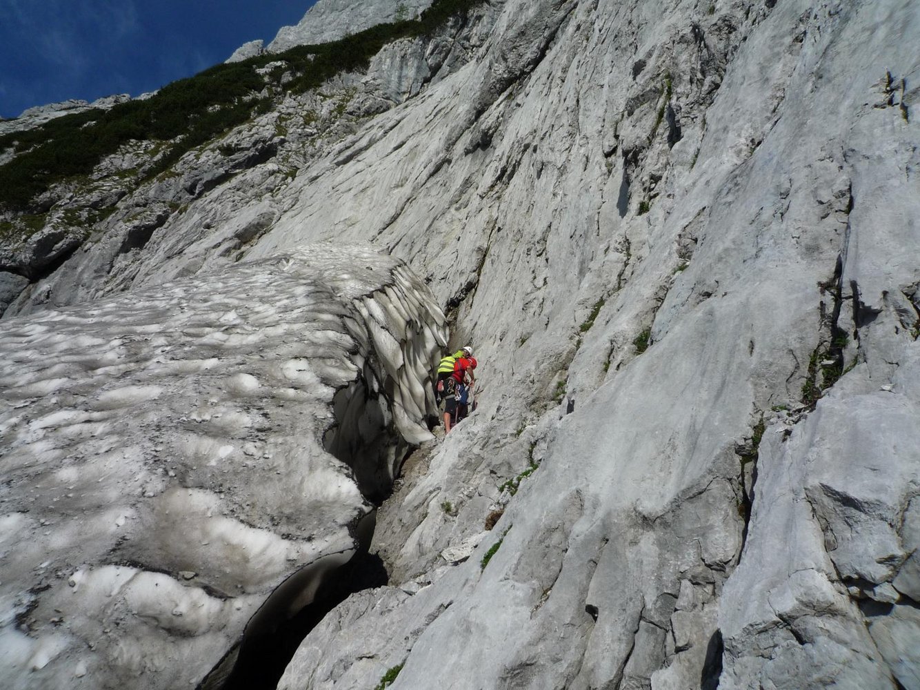 Oft liegt am Einstieg und am oberen Ende des Vorbaus bis Mitte Juni Restschnee, d.h. steile Schneefelder!