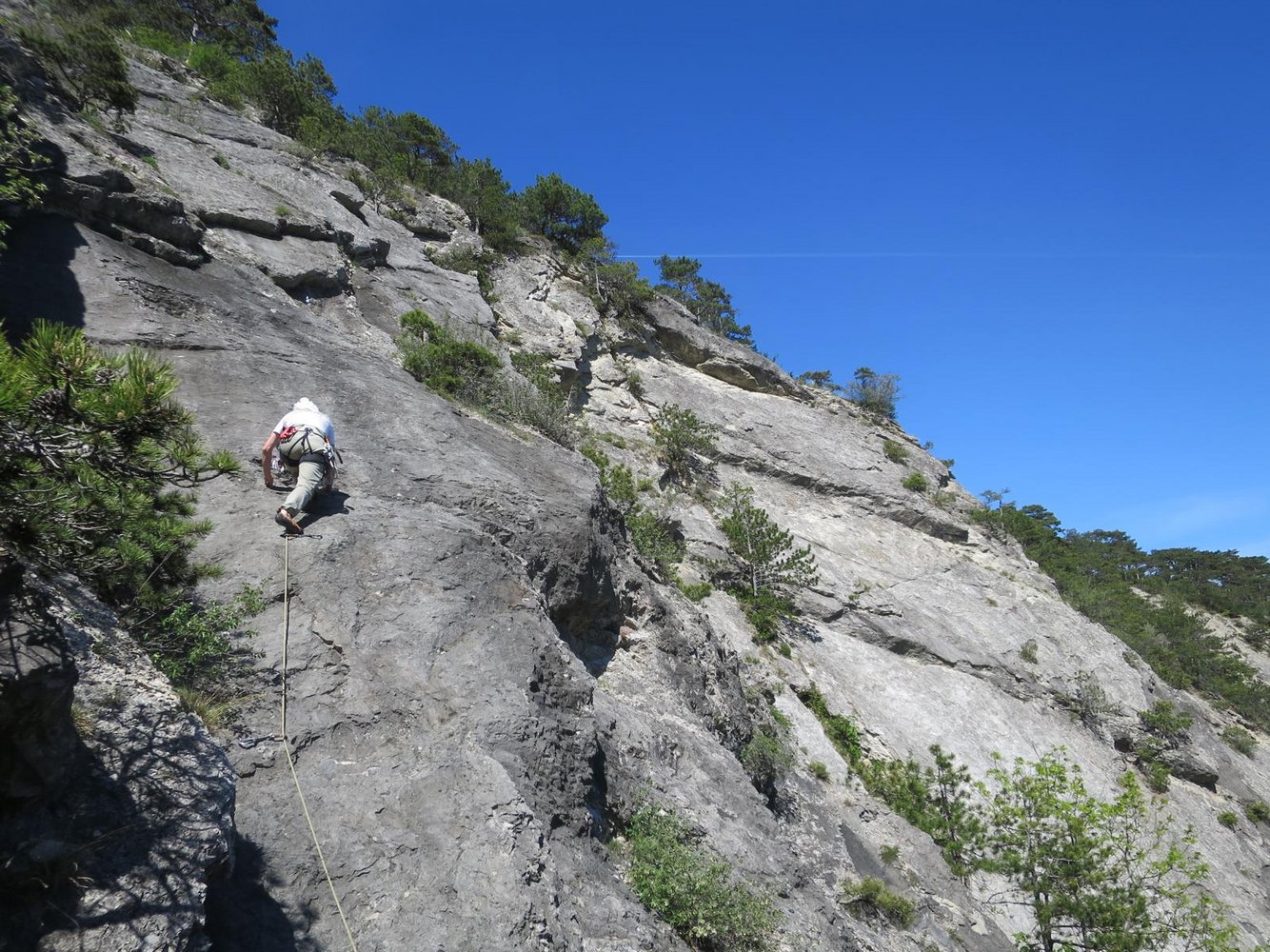 4. WILDERERSTEIG II 2 SL, 1. SL 20m, 2. SL 50 m. Alter, netter alpiner Anstieg, der öfters Solo begangen wurde ( und noch wird ). Neu ausgeschnitten, geputzt und abgesichert; recht guter Fels mit Gehpassagen. Einige Schlingen für Bäume und Latschen mitnehmen! Vom Standbaum ( markanter, waagrechter Ast links! ) einige Meter hinauf zum Weg; auf ihm in wenigen Minuten nach links abwärts zum Wandfuß. Die lohnende Variante 4a „Gustl III+“ ( 3 KH + 2 Baumschlingen ) führt über einen kl. Grat zu einer boulderartigen Linksquerung, die in den Orginalweg mündet. Der untere Teil v. 4a ist brüchig, steinschlaggefährlich und unlohnend!