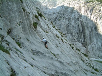 Von der Griesener Alm in Richtung Stripsenjoch bis in den "Wildanger", das ist ein Flachstück vor der letzten Steigung zur Hütte. (Abzweigung des Eggersteiges in Richtung Ellmauer Tor). Nun links ab Richtung Schlucht zwischen Fleischbank bis man auf den Eggersteig trifft, diesen bis zum Einstieg folgen (siehe Übersichtsfoto).