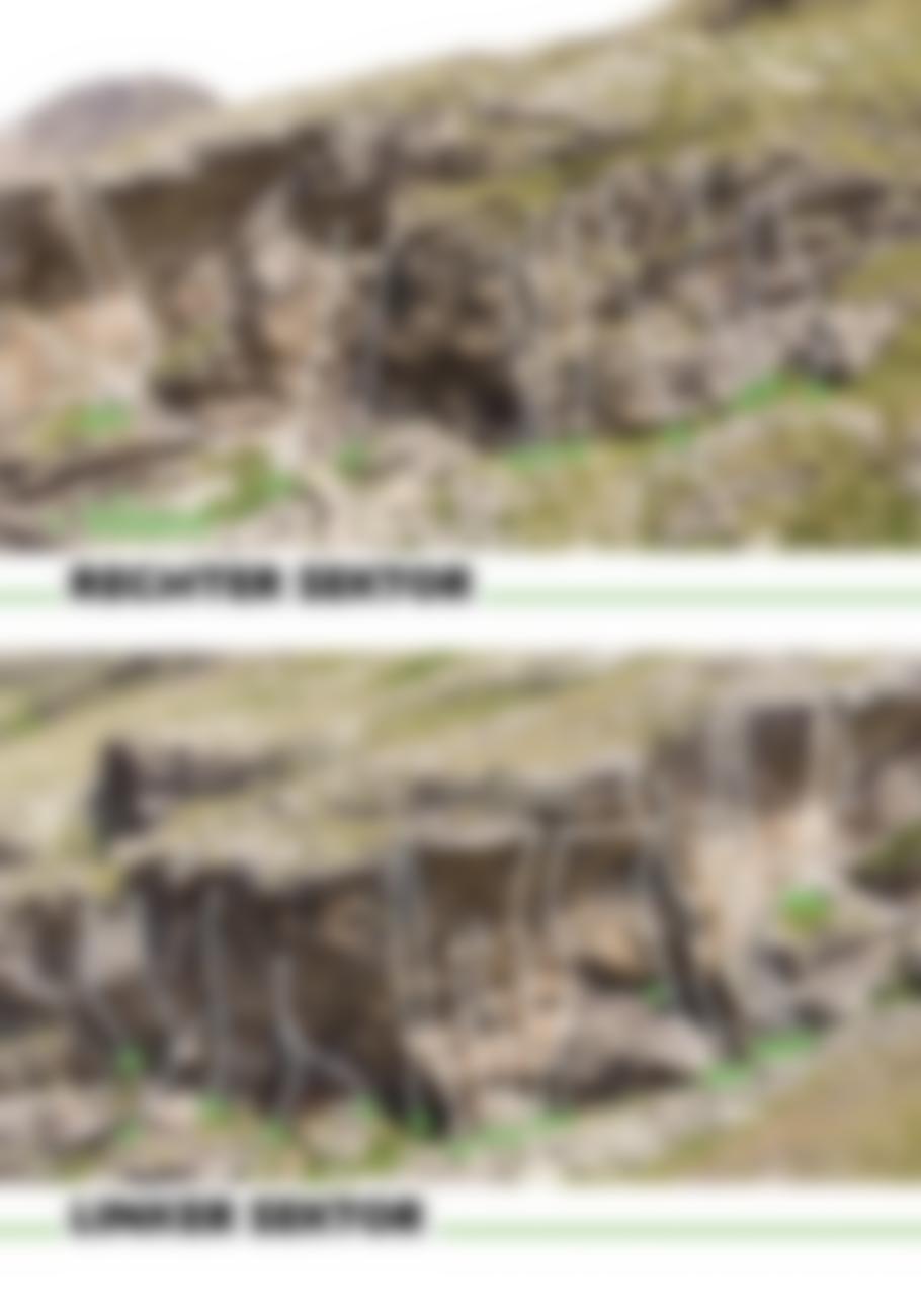 Der Fels hier ist sehr raues Urgestein, welches im mittleren Teil des Klettergartens ein paar Störzonen aufweist. Deswegen kann es hier noch ein paar lockere kleine Schuppen geben. Also bitte Obacht! Ausgerichtet ist dieses Massiv nach Westen. D.h. man hat bis etwa Mittag Schatten.