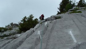 Hüttenklettergarten bei der Vorderkaiserhütte. Feste gute Kalkplatte mit Wasserrillen, südwestseitig gelegen, schnell trocknend.