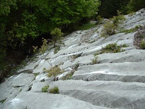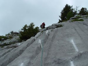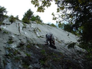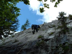 Hüttenklettergarten bei der Vorderkaiserhütte. Feste gute Kalkplatte mit Wasserrillen, südwestseitig gelegen, schnell trocknend.