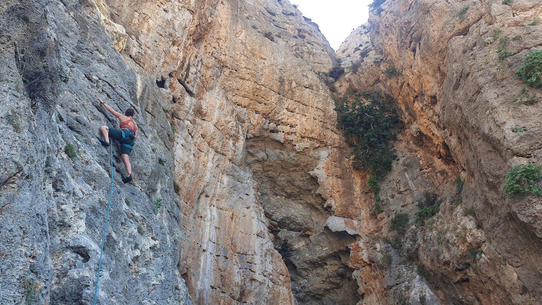 Das Tragen eines Helms wird in diesem Sektor stets empfohlen, da sich oberhalb der Wand oft Ziegen aufhalten.