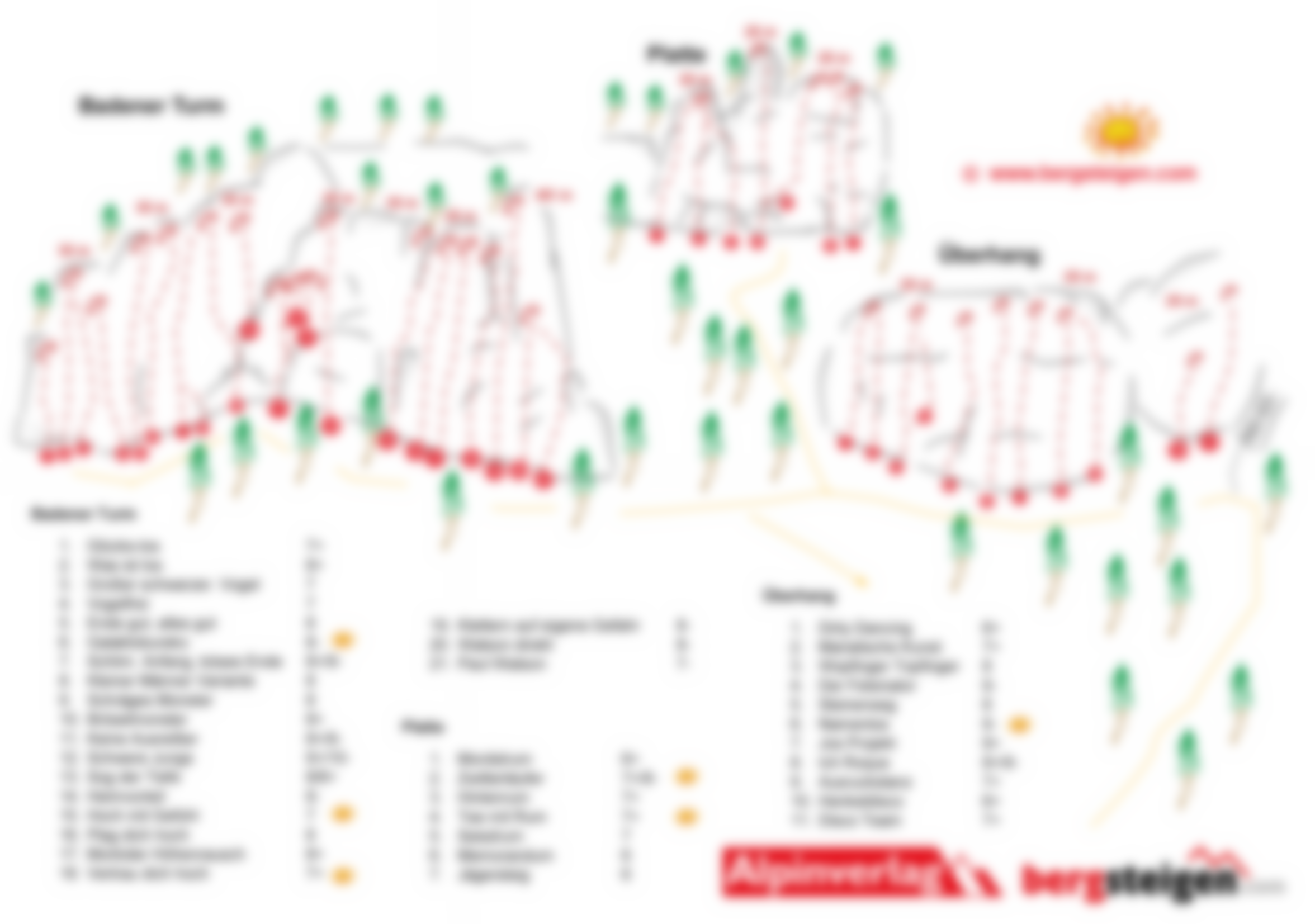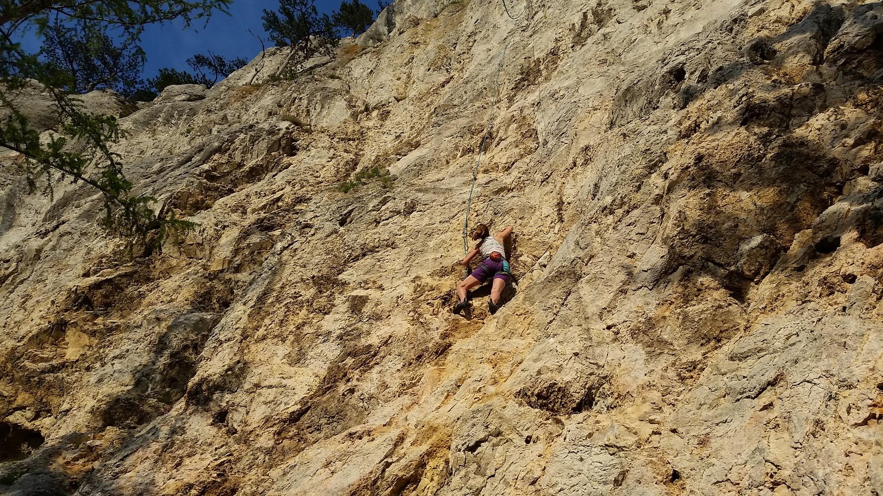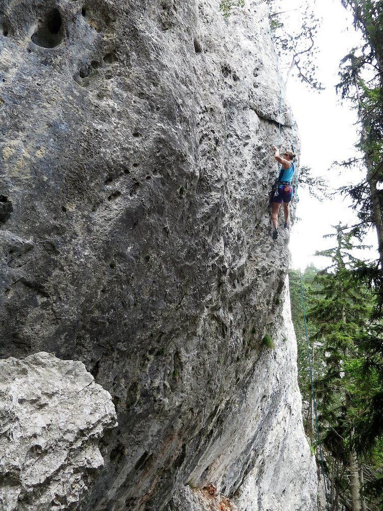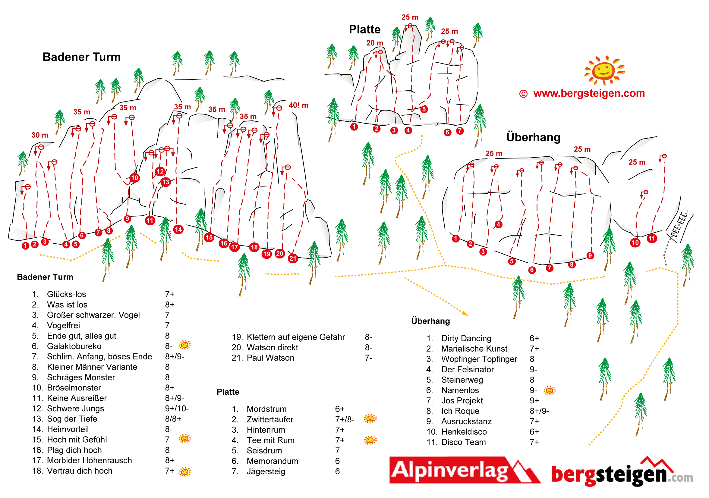 Toller Klettergarten mit drei Sektoren - Badener Turm, Platte und Überhang. Am Badener Turm dominiern lange, steile und auch nicht immer ganz feste Routen, auf der Platte Genusskletterei bis 7+/8- und am ersten Sektor, dem Überhang steile Wandkletterei. Die Sektoren sind ab ca. 14 Uhr in der Sonne, wobei bei Platte und Überhang Bäume am Einstieg Schatten geben.