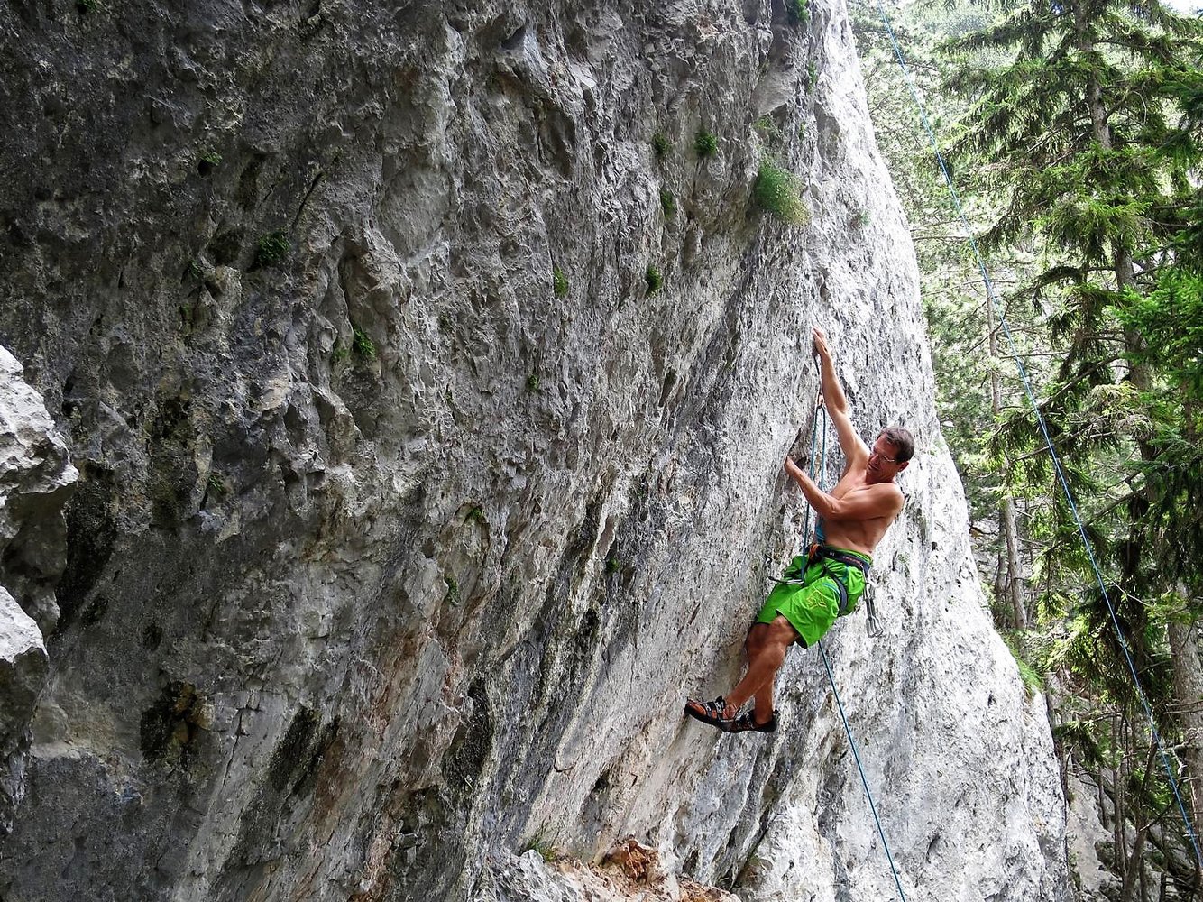 Kletterausrüstung, 14 Express u. Helm. Für die Tour Nr. 19 braucht man ein 80 Meter Seil, sonst reicht 70 m