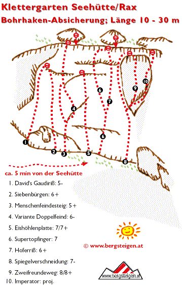 Neuer Klettergarten auf dem Raxplateau/Preinerwand, bietet auch dem Genußkletterer einige schöne Touren. Der Klettergarten wurde vom Raxerschließer Thomas Behm und Gef. eingerichtet. Außergewöhnlich schöne Klettereien in allen Schwierigkeitsgrade in den obersten Ausläufern der Preinerwand. Meist hervorragender, steiler Gebirgskalk, nur in den leichten Routen manchmal nicht ganz festes Gestein, (dass aber bald durch die vermehrten Begehungen verschwinden wird). Abwechslungsreiche Kletterei an Rissen, Kaminen, Verschneidungen oder griffige Wandzonen und großen Überhängen.